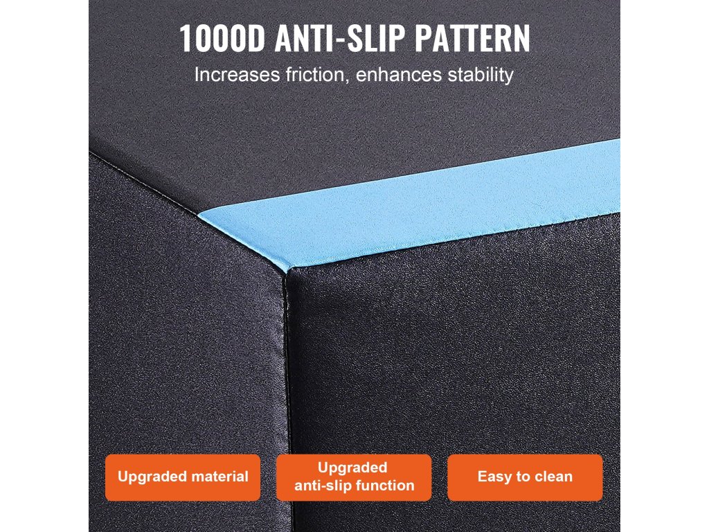 Továbbfejlesztett csúszásmentes felület 1000D tapadási mintázattal, amely tartósságban, szálszámban és sűrűségben felülmúlja a hagyományos 500D hálót. Növeli a súrlódást és a stabilitást. Újrahasznosított pamutanyaggal töltve, amely növeli az összsúlyt és javítja a stabilitást, biztonságos környezetet biztosít az ugróedzésekhez.