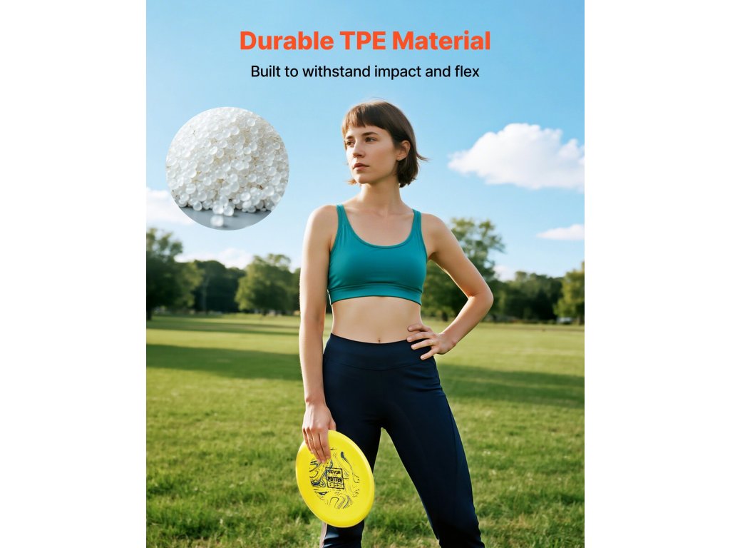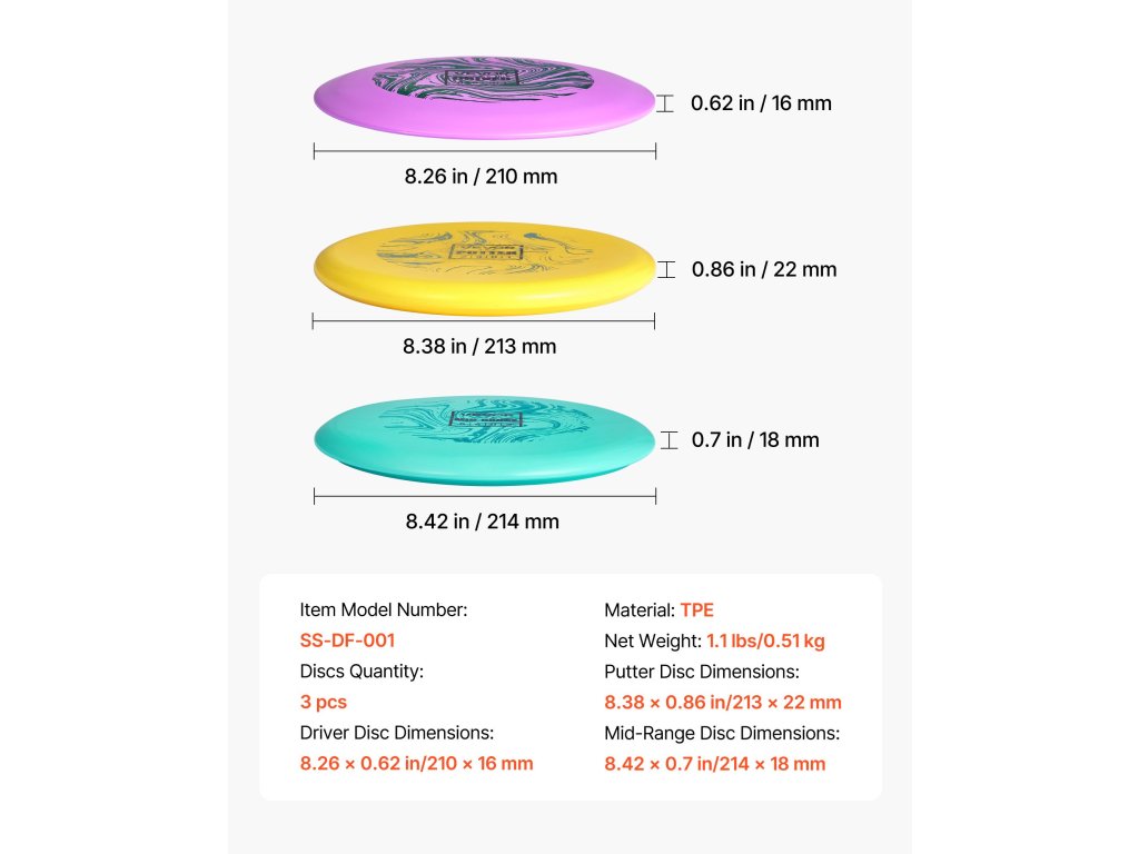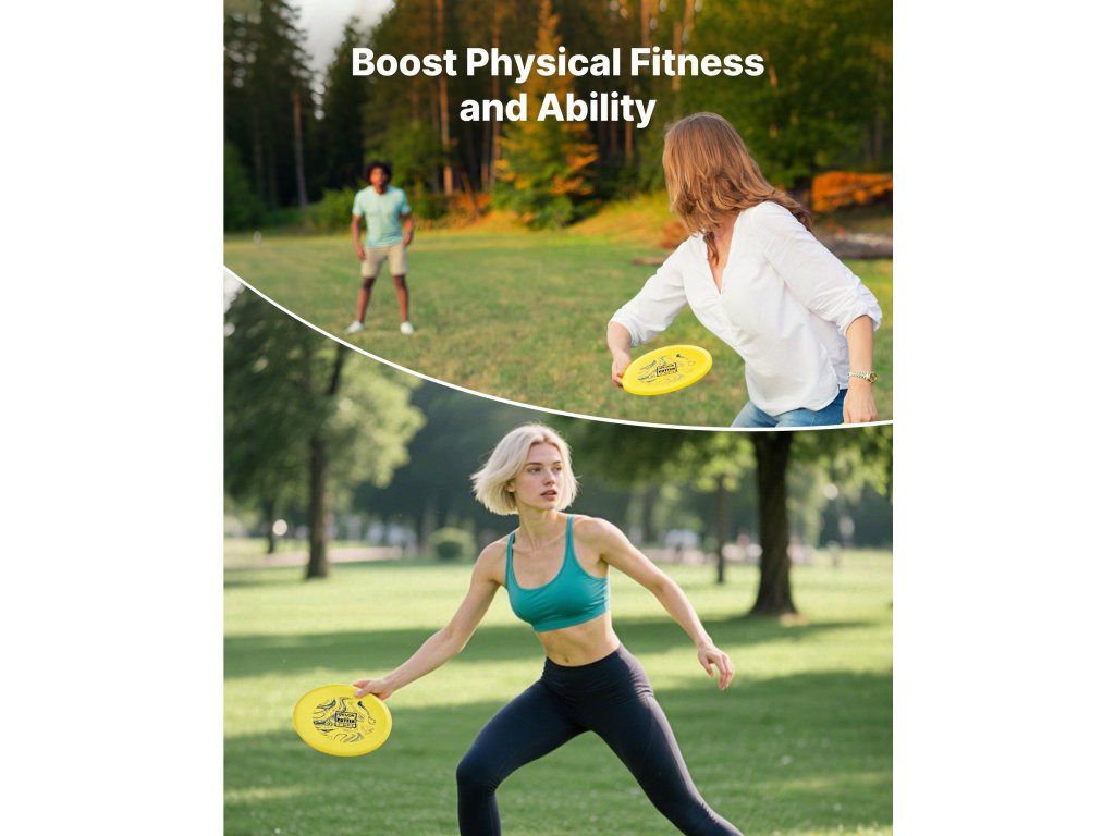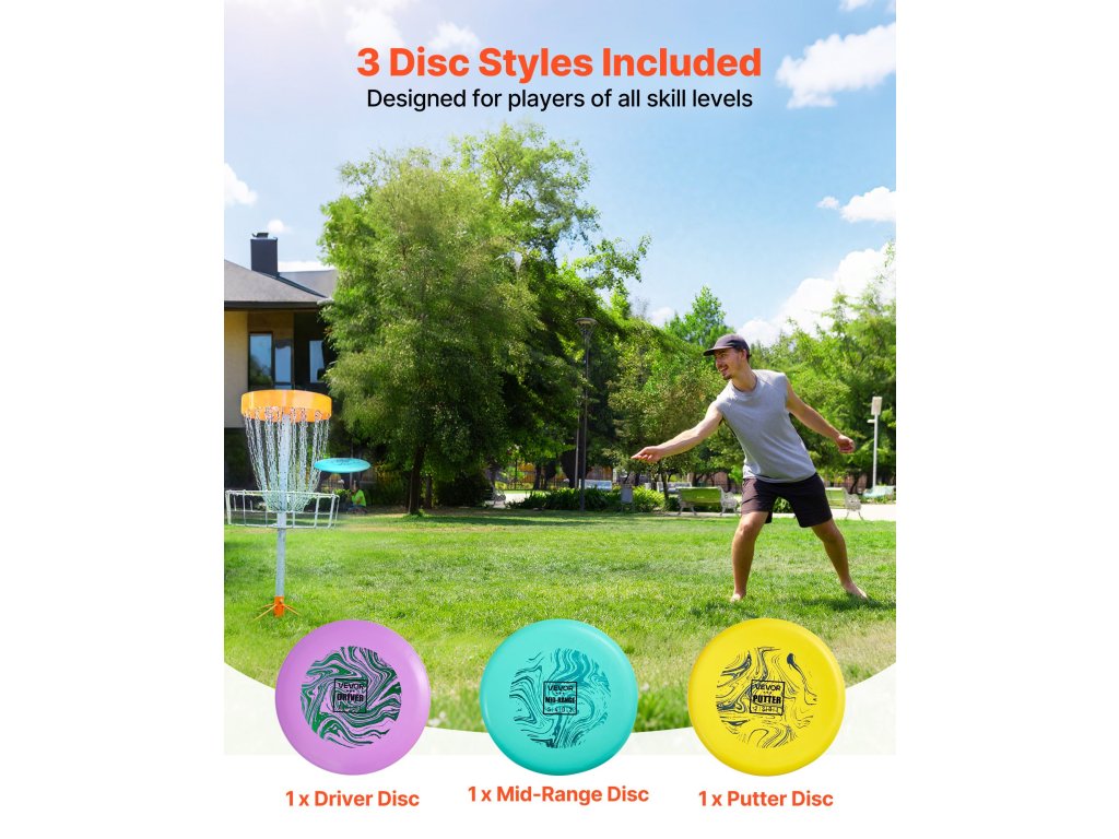 Ez a discgolf kezdő szett tartós TPE-ből készült, nagy ütésállósággal. Az ergonomikus kialakítás elősegíti a felsőtest edzését és a törzskoordinációt. A nyomtatott utasítások megkönnyítik a kezdők számára a kezdést, a haladó játékosok számára pedig a fejlődést. Kompakt és könnyen hordozható a parkokban, gyepen, strandokon való használathoz.