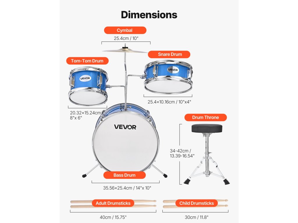 3 darabos gyermek dobfelszerelés, 14 hüvelyk / 355,6 mm, 2 pár ütőverővel