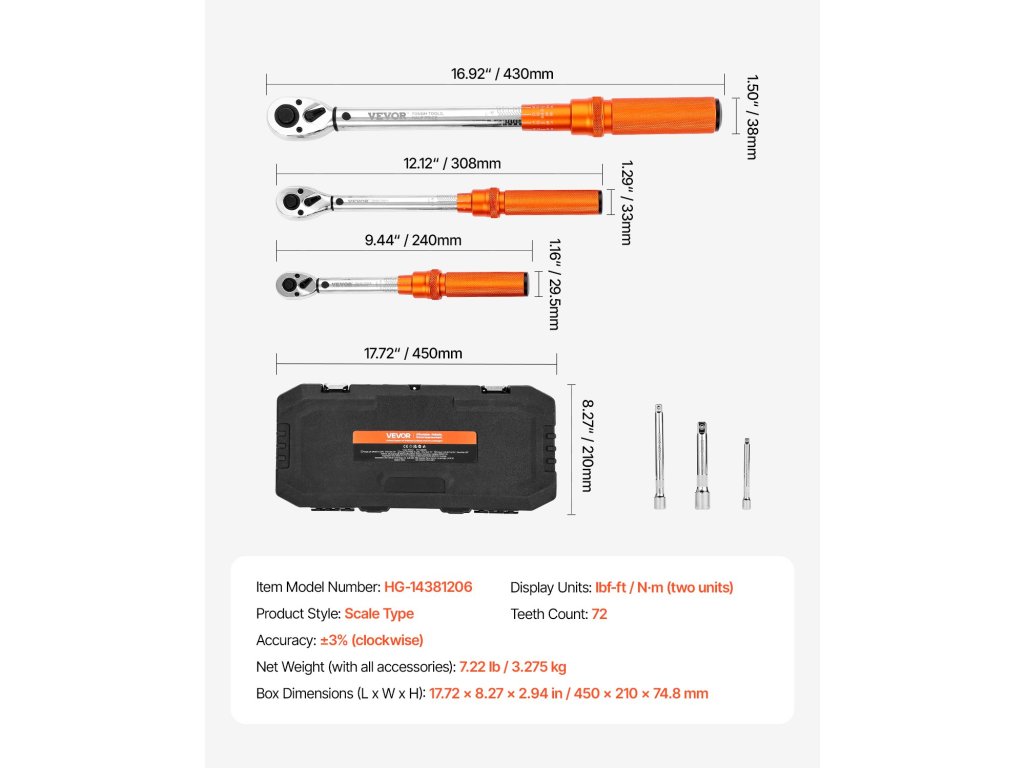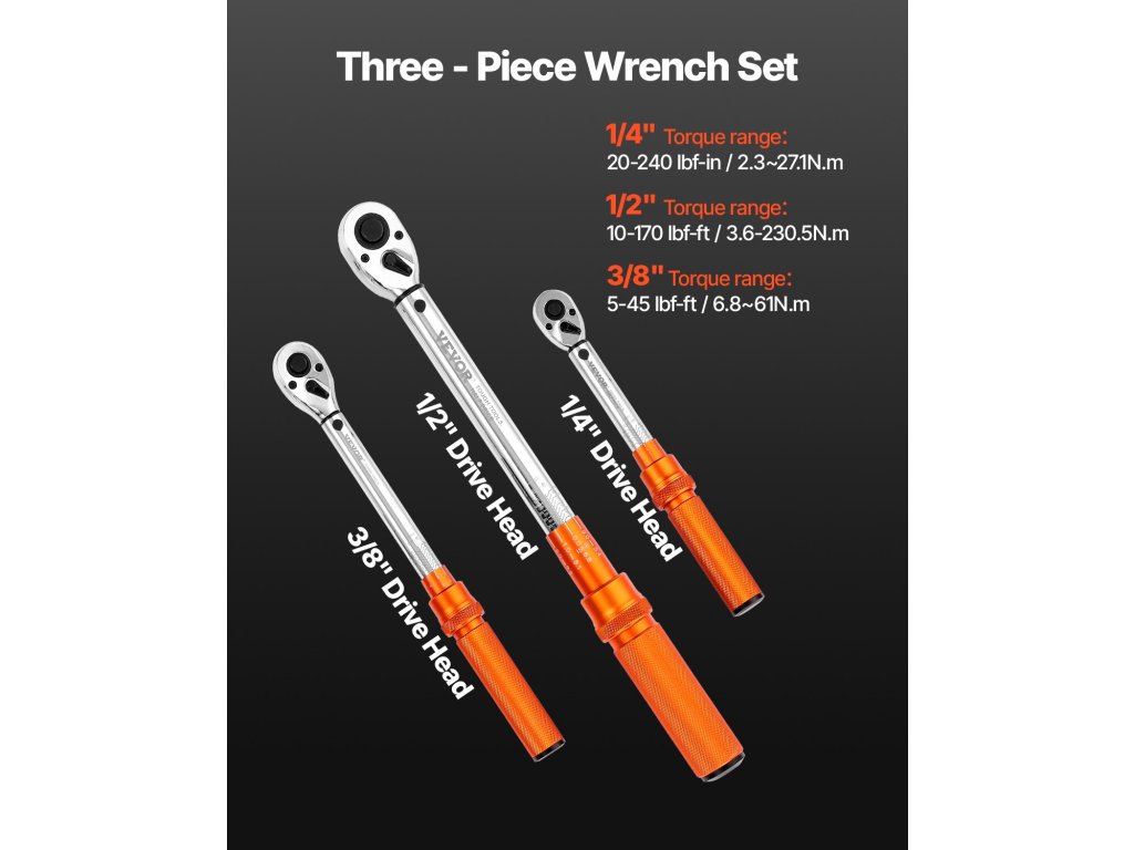 3 darabos nyomatékkulcs-készlet 1/4·3/8·1/2, 5–45/10–170 lbf-ft, ±3%