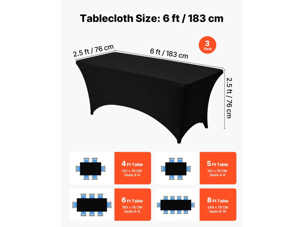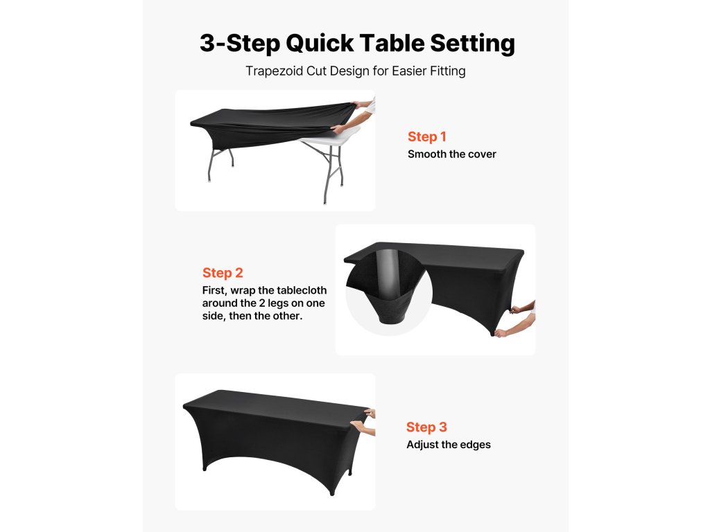 3 db-os rugalmas terítőkészlet 1,8 m-es téglalap alakú asztalhoz, fekete, gyűrődésmentes