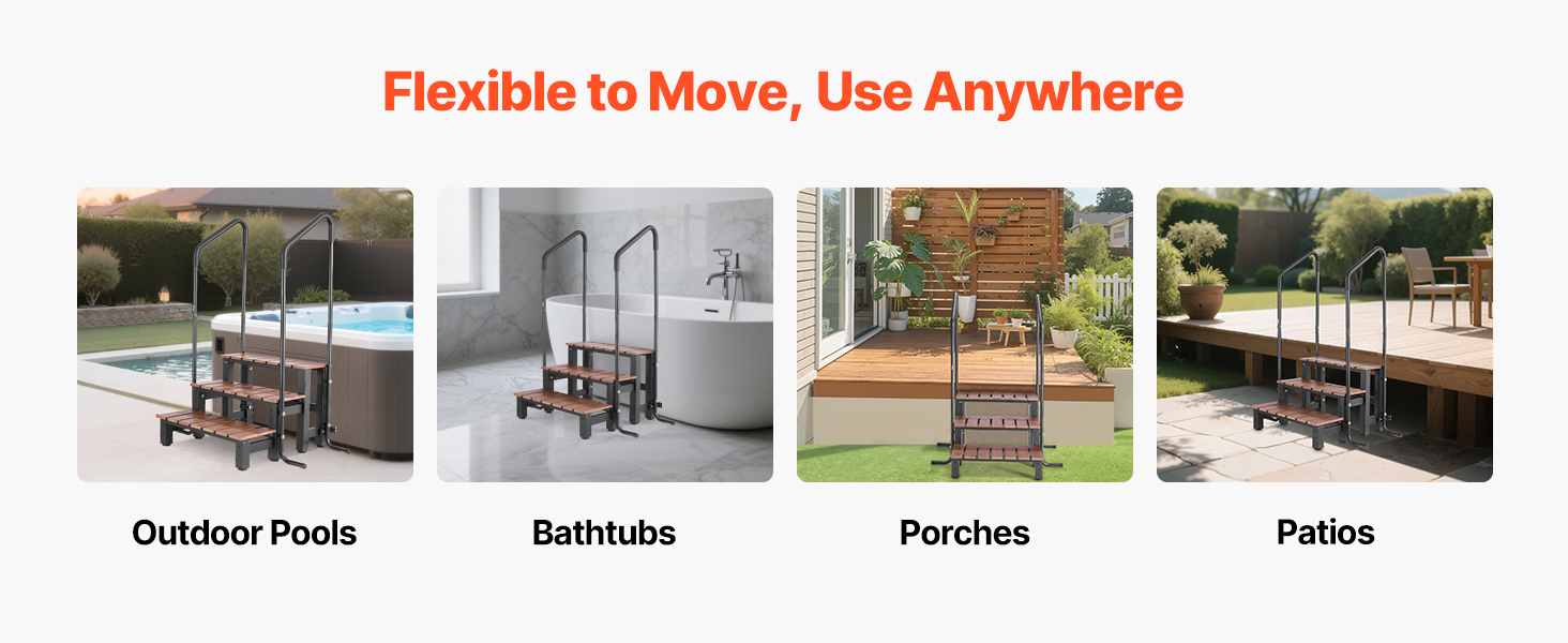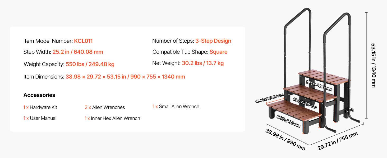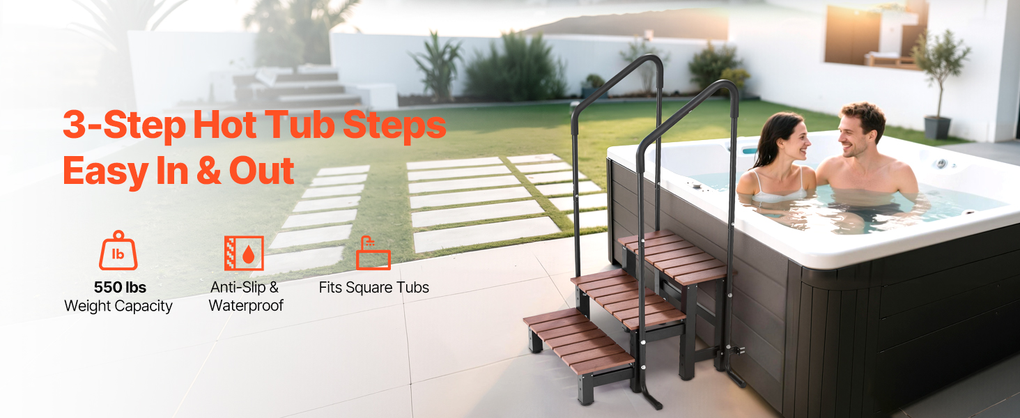 A biztonság érdekében tervezett, masszív pezsgőfürdő lépcsőfok. A nagy teherbírás és a széles csúszásmentes felület biztonságos és kényelmes lábtartást biztosít. Az időjárásálló anyagok ellenállnak a kültéri igénybevételnek. Négyzet alakú kádakhoz méretezve. Ideális pezsgőfürdőkhöz, gyógyfürdőkhöz és föld feletti vagy felfújható medencékhez.