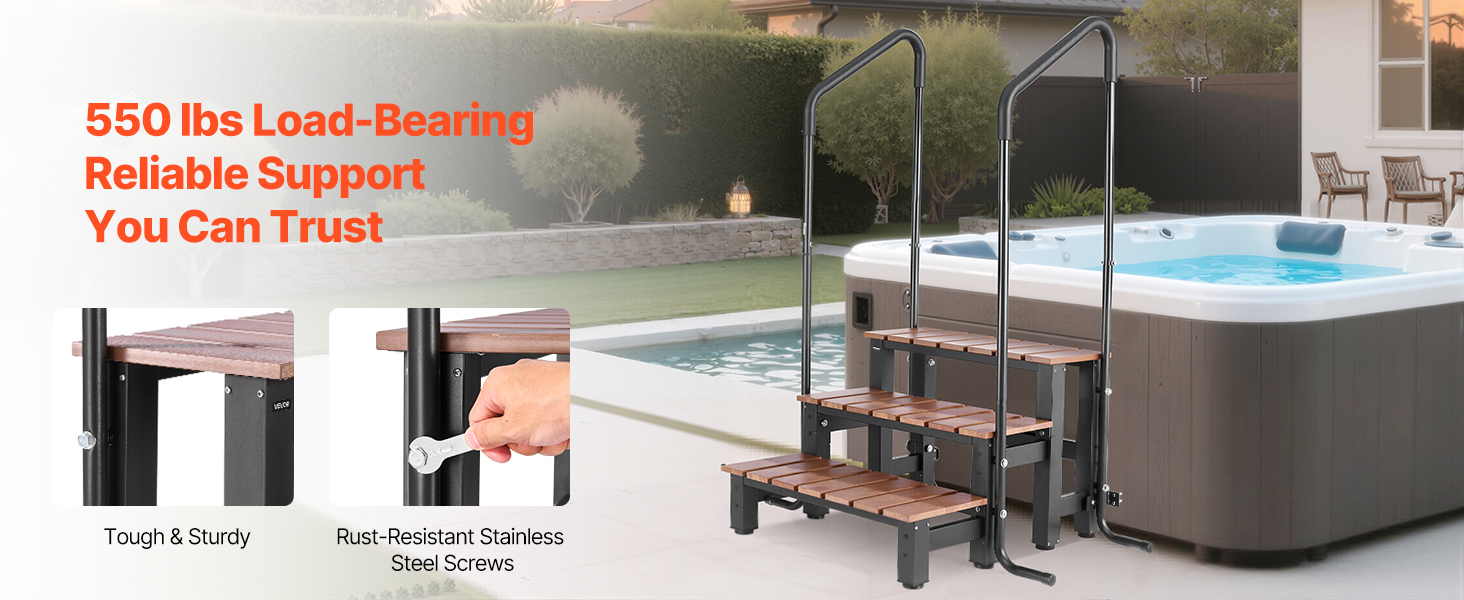 3 lépcsős jakuzzi lépcső korláttal, szélesség 640,1 mm, teherbírás 249,5 kg