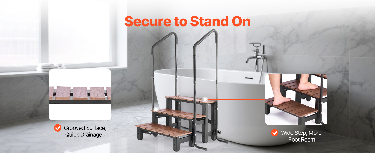 A vízszintes vízelvezető barázdák felgyorsítják a száradást és segítenek csökkenteni a csúszásveszélyt. Az extra széles lépcsőfokok bőséges alátámasztást biztosítanak a kényelmesebb álláshoz.