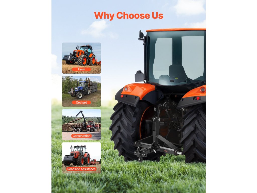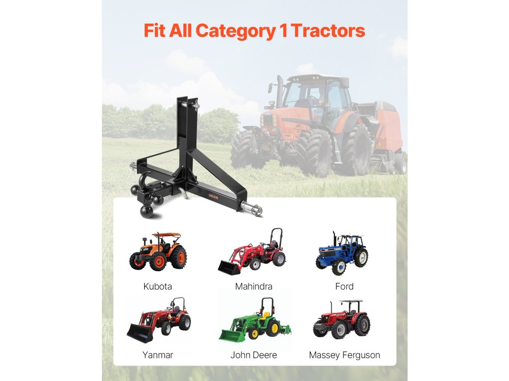Ez a hárompontos vonóhorog-vevőkészülék kompatibilis az olyan kompakt traktorokkal, mint a Kubota, Mahindra, Ford, Yanmar, John Deere és Massey Ferguson. Könnyű csatlakozást biztosít és kiküszöböli a kompatibilitási problémákat, időt takarítva meg.