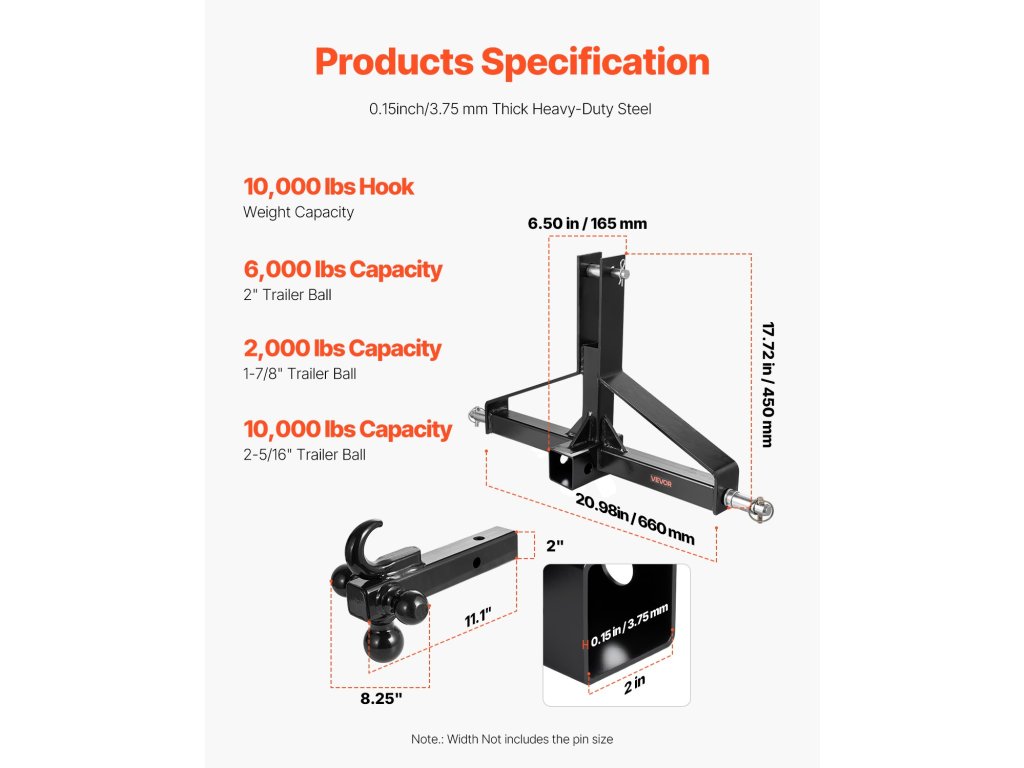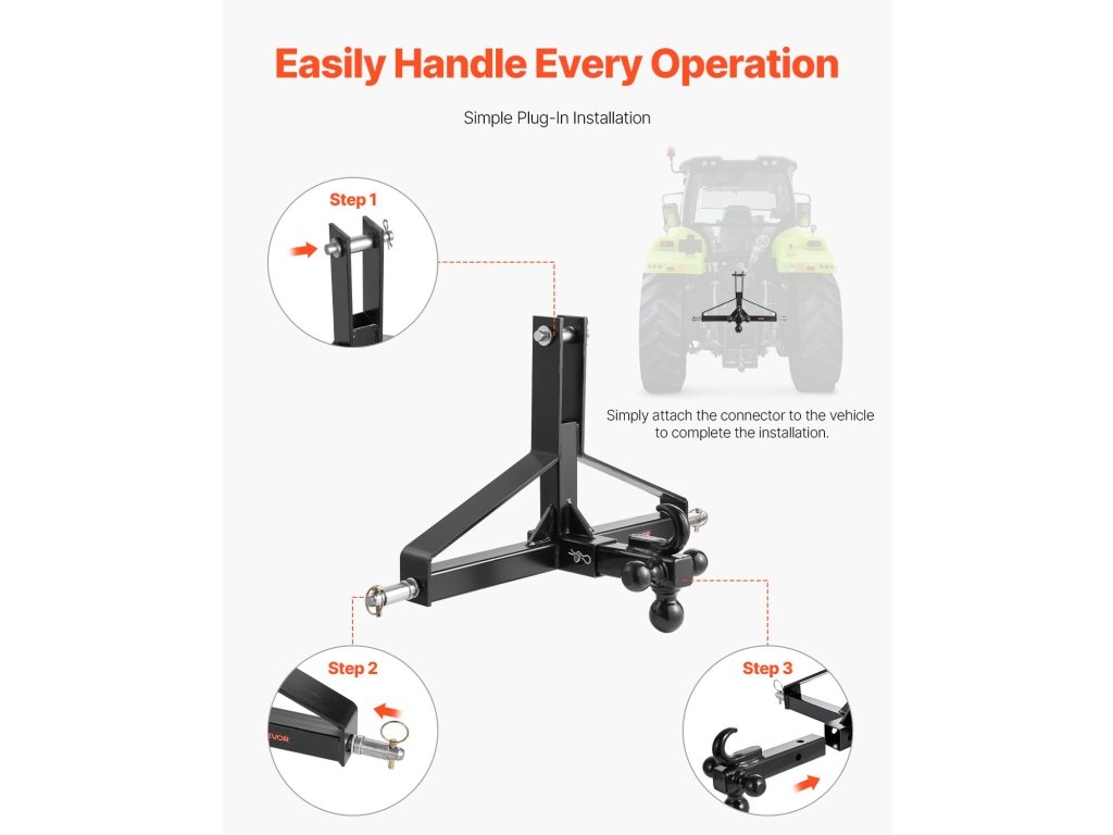 A 0,15 hüvelyk vastagságú, korrózióálló bevonattal ellátott acélból készült hárompontos vonóhorog garantálja a stabil és megbízható működést. A precíziós hegesztés erősíti a különféle munkakövetelményekhez igazodó kialakítást. Illeszkedik a legtöbb 2 hüvelykes vonóhoroggal rendelkező traktorhoz, a könnyen összeszerelhető és szétszerelhető gömbhorog biztosítja a problémamentes használatot.
