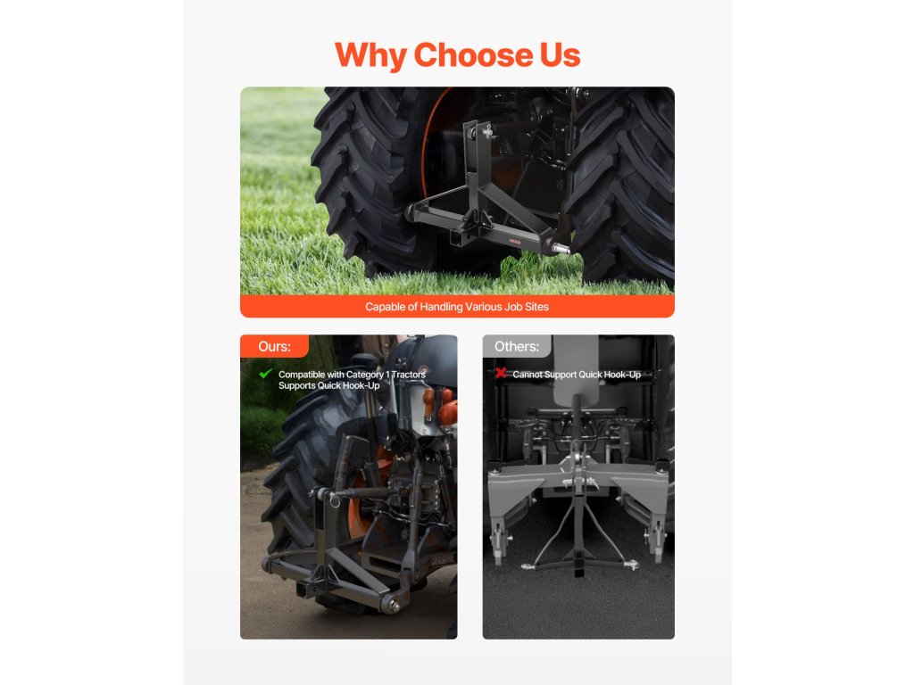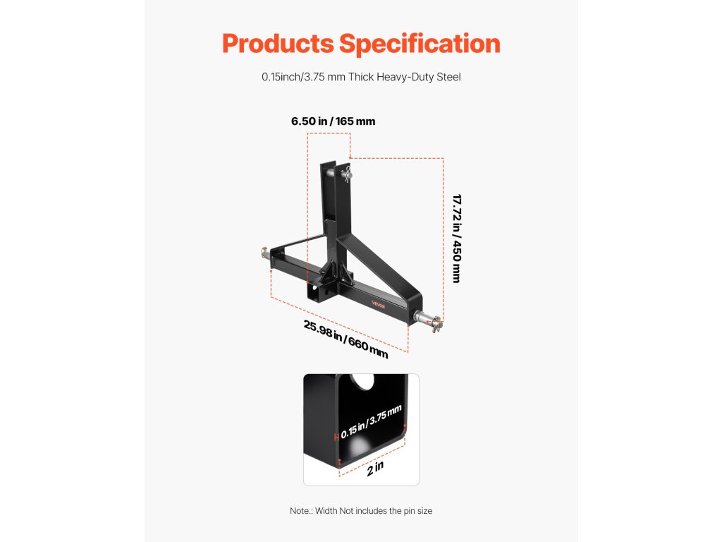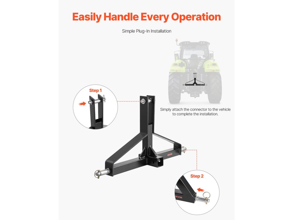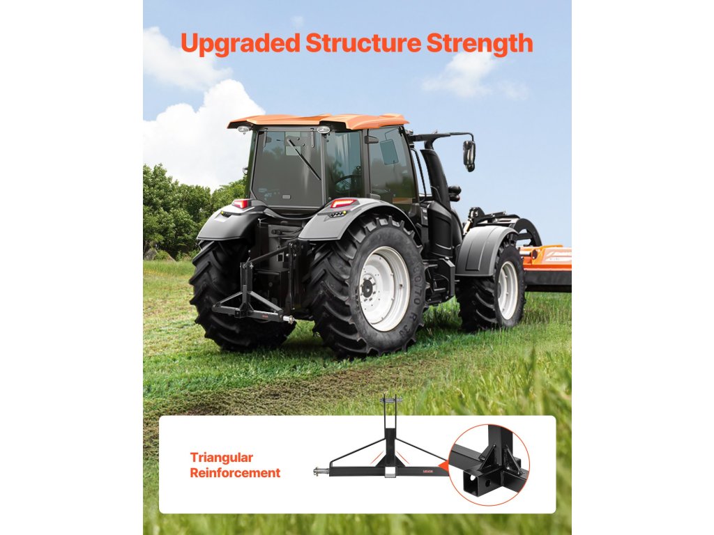 a 3 pontos bilincs 0,15 hüvelyk vastagságú acélból készül, korróziógátló kezeléssel, és garantálja a stabil és megbízható teljesítményt. A precíziós hegesztés erősíti a különböző munkakövetelményekhez igazodó kialakítást. Alkalmas a legtöbb 2 hüvelykes vonóhoroggal rendelkező traktorhoz, a könnyen felszerelhető és eltávolítható gömbhorog biztosítja a problémamentes használatot.