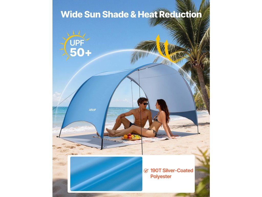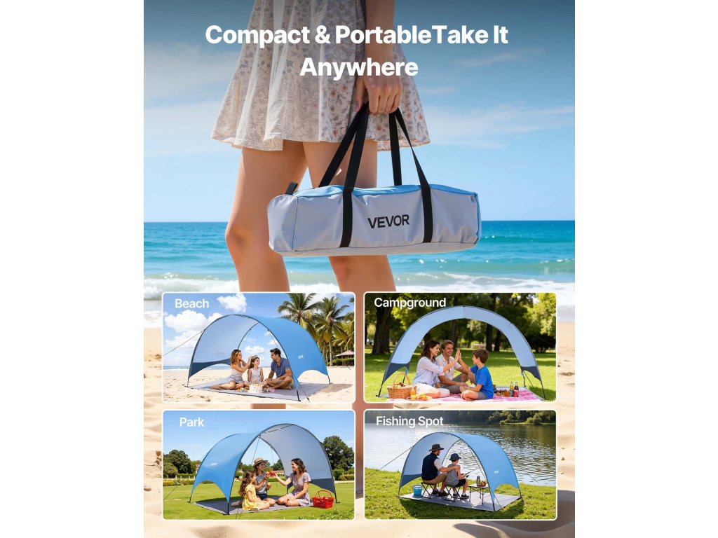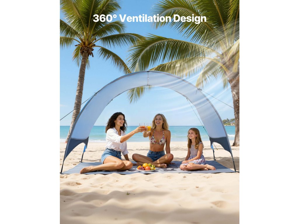 Hordozható strandsátrunk bőséges árnyékot biztosít, hogy megvédje Önt és családját a kemény, közvetlen napsütéstől, így biztosítva egy kényelmes és pihentető napot.