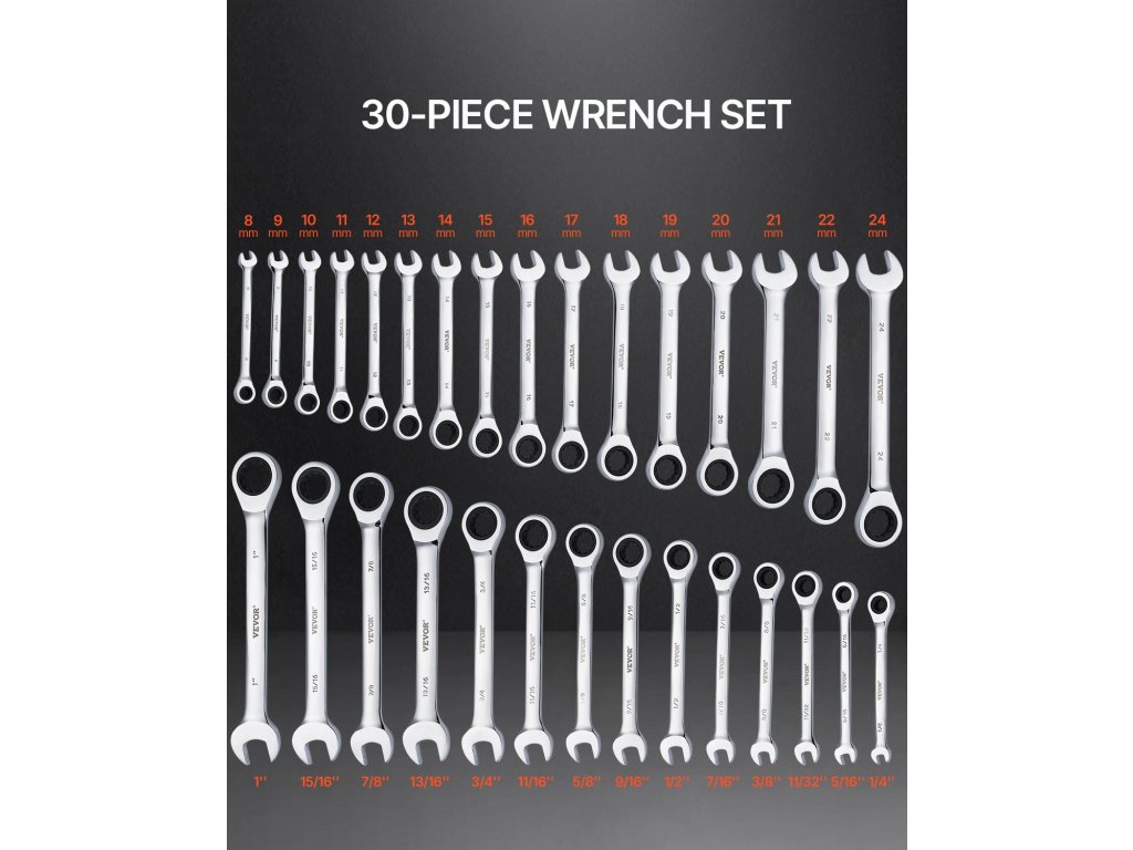 30 darabos racsnis csillagkulcs készlet, cr-v, sae 1/4"–1", 8–24 mm
