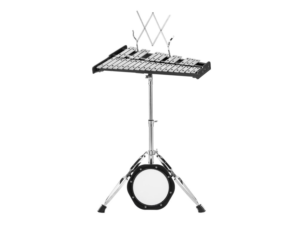 Az állvány nagy szilárdságú horganyzott anyagból készült, és két összekötő lábbal ellátott, masszív konstrukcióval rendelkezik, amely garantálja a xilofon biztonságos rögzítését. A 25,6 - 37,8 hüvelyk közötti állítható magassági tartománynak és az állítható szögeknek köszönhetően alkalmazkodik a különböző korú és magasságú emberekhez.