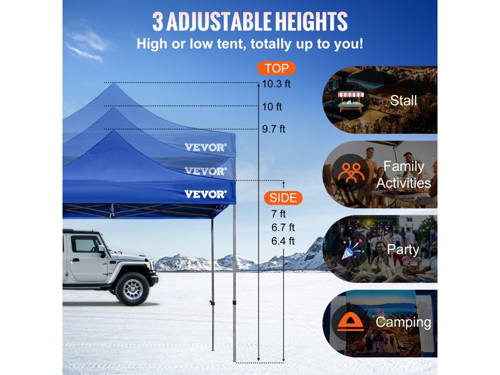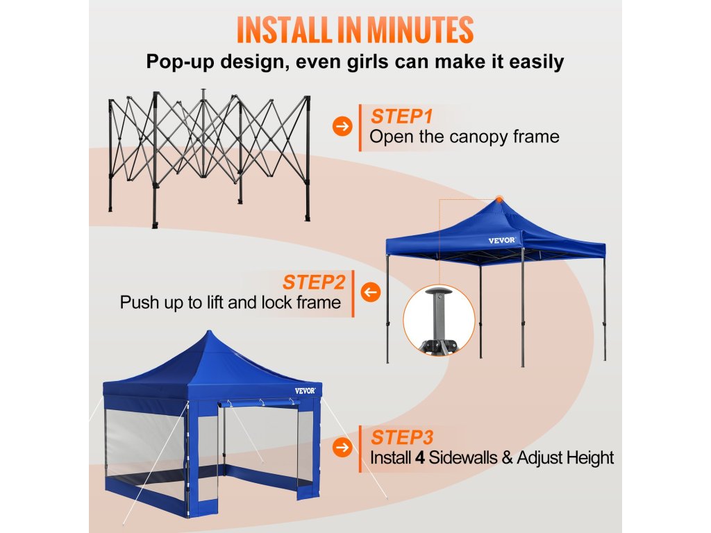 Az oldalfalakkal ellátott, behúzható pavilon sátor körülbelül 100 m²-es helyet biztosít 6-7 személy számára. Elengedhetetlen szabadtéri partikhoz, esküvőkhöz vagy más kereskedelmi tevékenységekhez.
