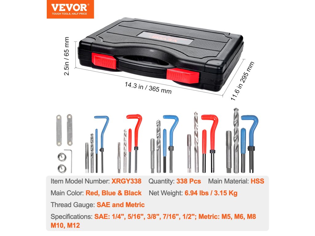 338 darabos menetjavító készlet, m5–m12, 1/4"–1/2", gyorsacél fúrófejek