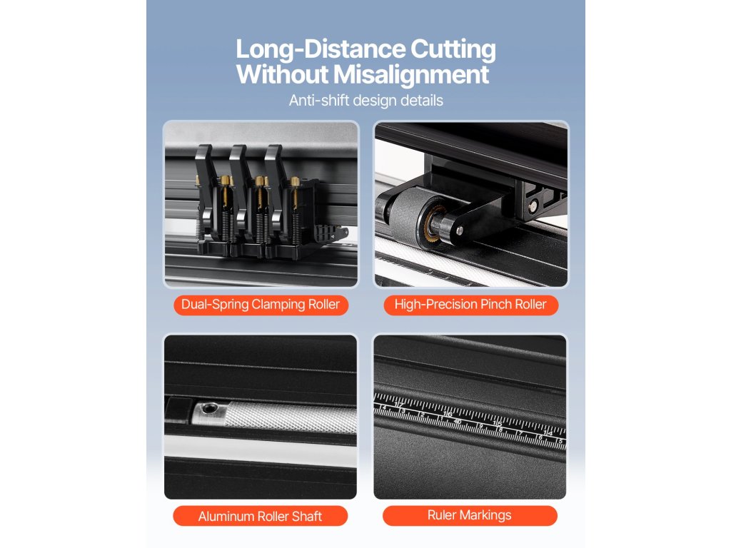 A pontos pozicionálás érdekében a részletekre összpontosítunk, mivel ez a professzionális megjelenésű projektek létrehozásához előnyös. A vinylgép precíziós skálát használ a mérés segítésére. Két állítható, két rugós nyomógörgő és egy alumínium racsnis rúd megakadályozza a papír túlzott elmozdulását.