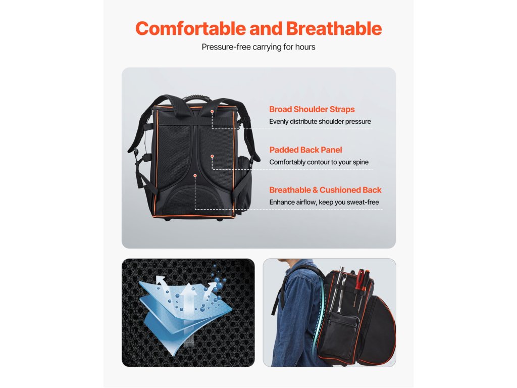 A váll megterhelésének csökkentésére tervezett hegesztőfelszereléses táska állítható, széles vállpántokkal és párnázott hátlappal rendelkezik a további kényelem érdekében. A légáteresztő, párnázott hátrész elősegíti az optimális légáramlást, hogy a háta izzadásmentes és kényelmes maradjon.