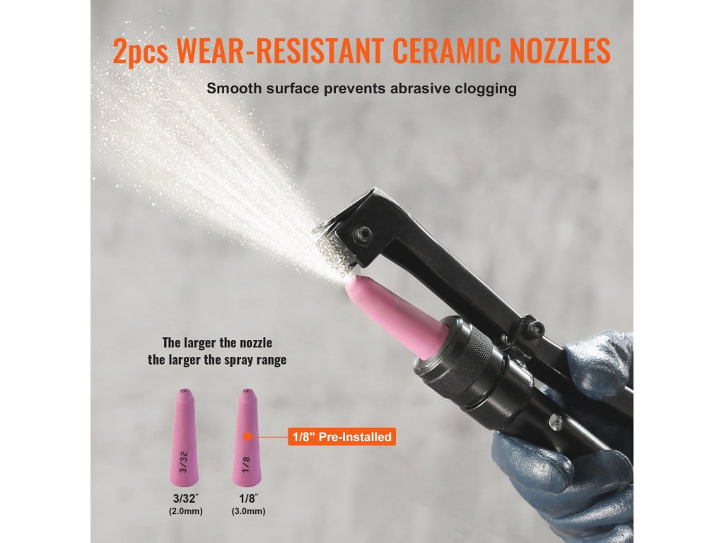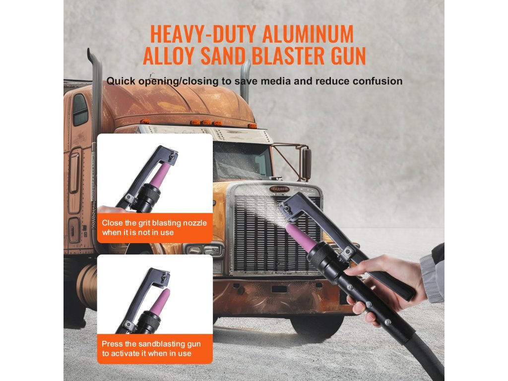 A megerősített alumínium homokfúvó pisztoly könnyű és pontos vezérlést tesz lehetővé, így alkalmas nagyszabású és hosszan tartó homokfúvásra. A hagyományos, golyós szeleppel ellátott sárgaréz szórópisztolyokhoz képest a mi tartós homokfúvópisztolyunk tartósabb, megbízhatóbb és könnyebben használható.