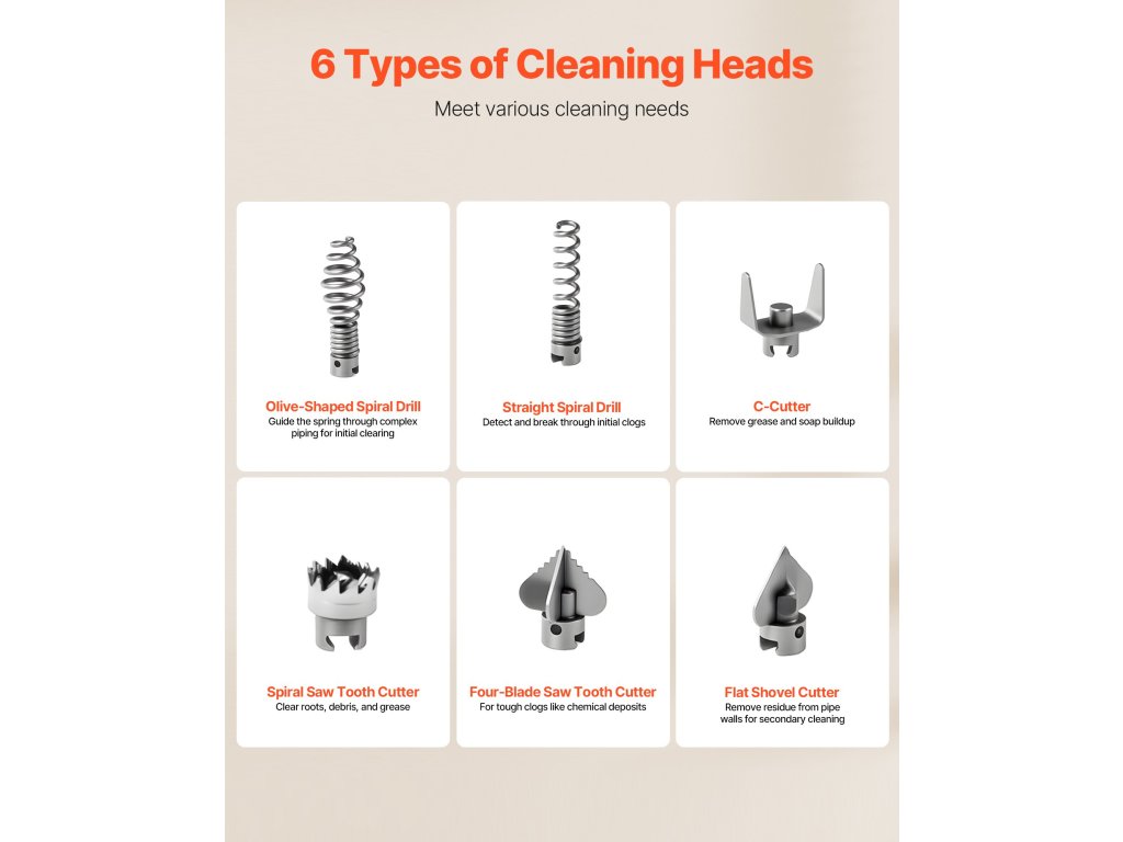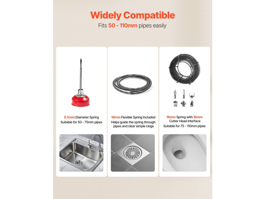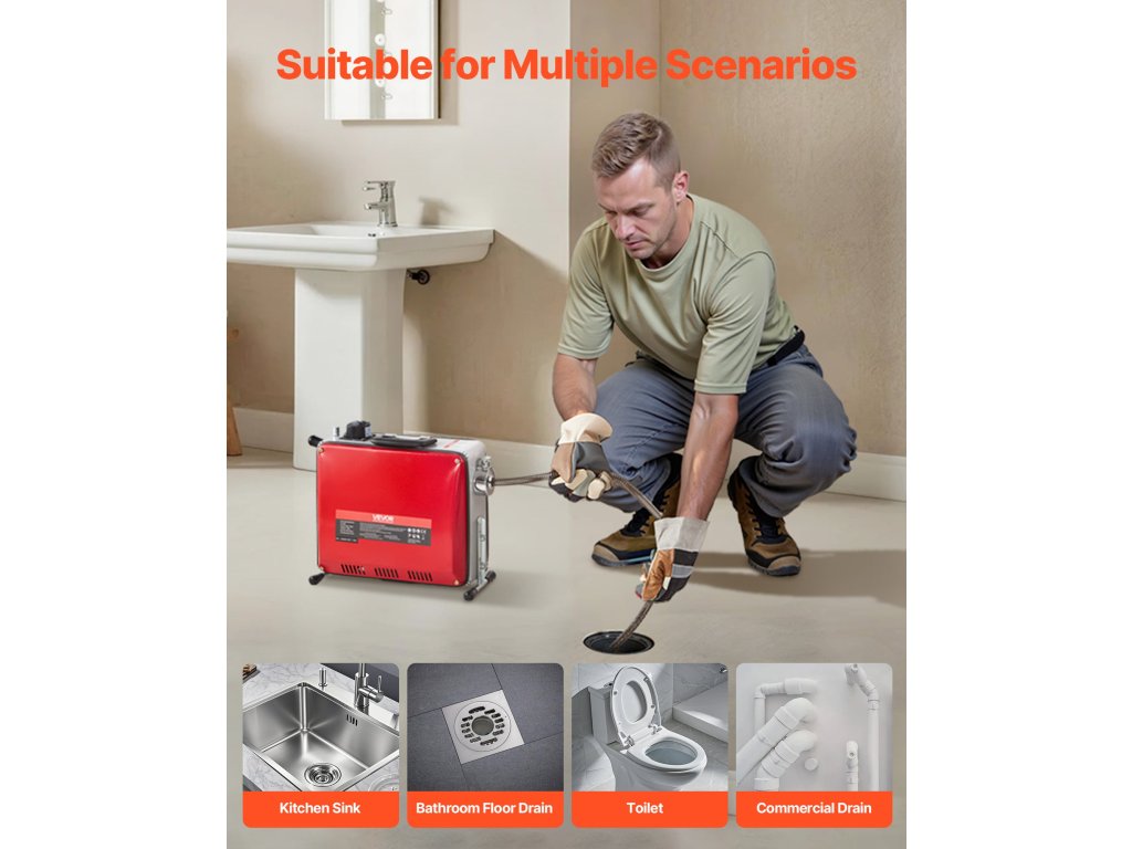 Legyen szó mosogatókról, zuhanyzókról, lefolyókról, WC-kről, fürdőszobákról, konyhákról, padlóösszefolyókról vagy kereskedelmi létesítményekről, a VEVOR lefolyótisztító gép sokoldalú megoldásokat kínál a tisztítási igények széles körének kielégítésére.