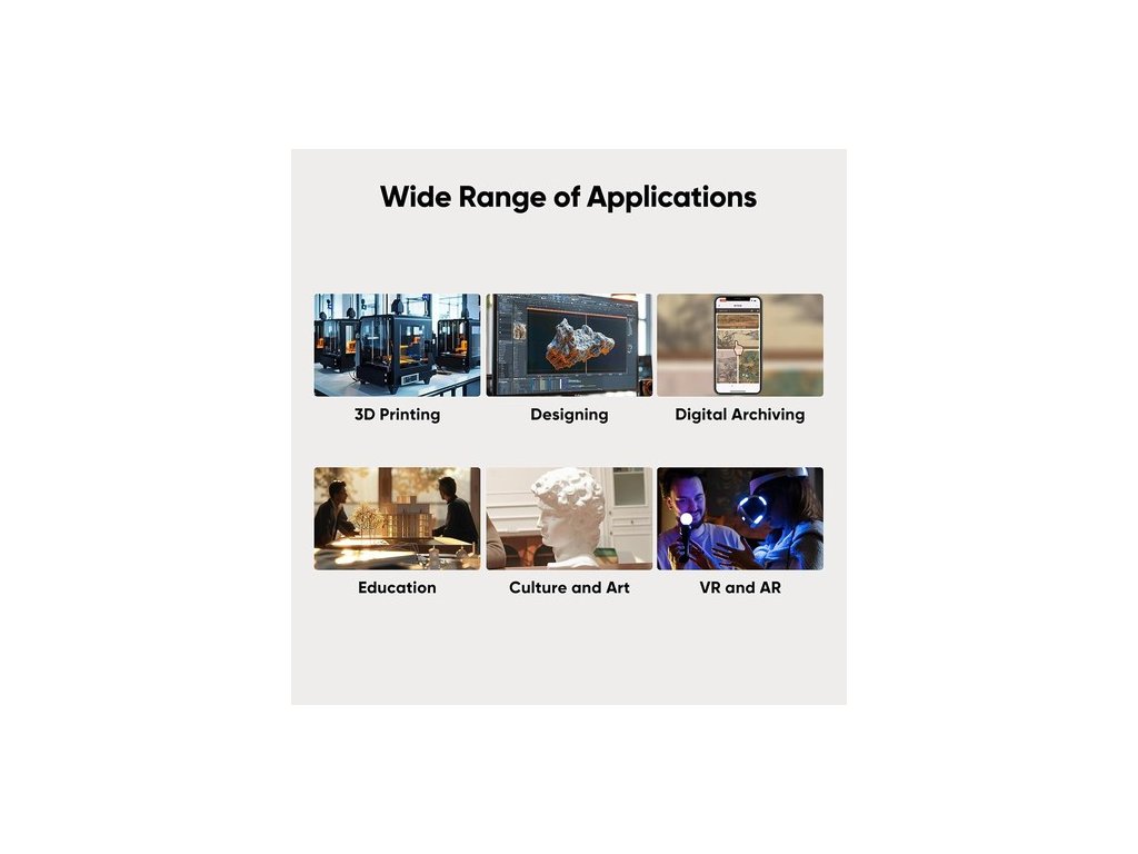 A kék fény technológiának köszönhetően a 3DMakerpro Moose 3D szkenner 0,03 mm-es pontosságot ér el. Ezáltal a modell mérete végtelenül közelít a valósághoz. A 0,07 mm-es felbontással a részletes pontfelhők tökéletesen megőrzik a tárgyak részleteit, így kifinomult modelleket biztosítanak a nyomtatási vagy képalkotási projektekhez.