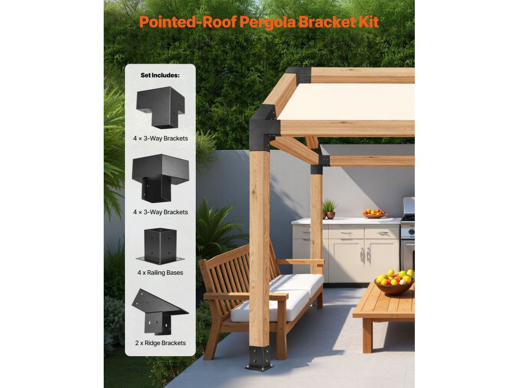 A1: Ez a készlet 4 darab háromirányú szögletes konzolt, 4 darab alapsínt, 4 darab kétirányú szögletes konzolt és 2 darab gerinckonzolt tartalmaz. A készlet csúcsos tetővel rendelkező pergola építésére alkalmas.