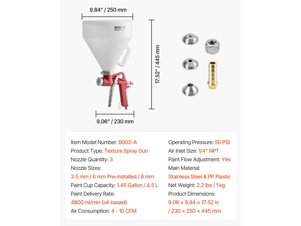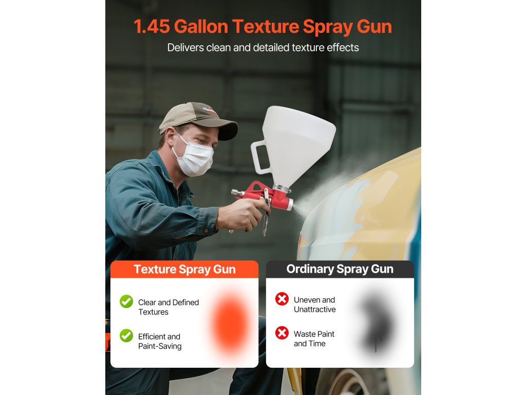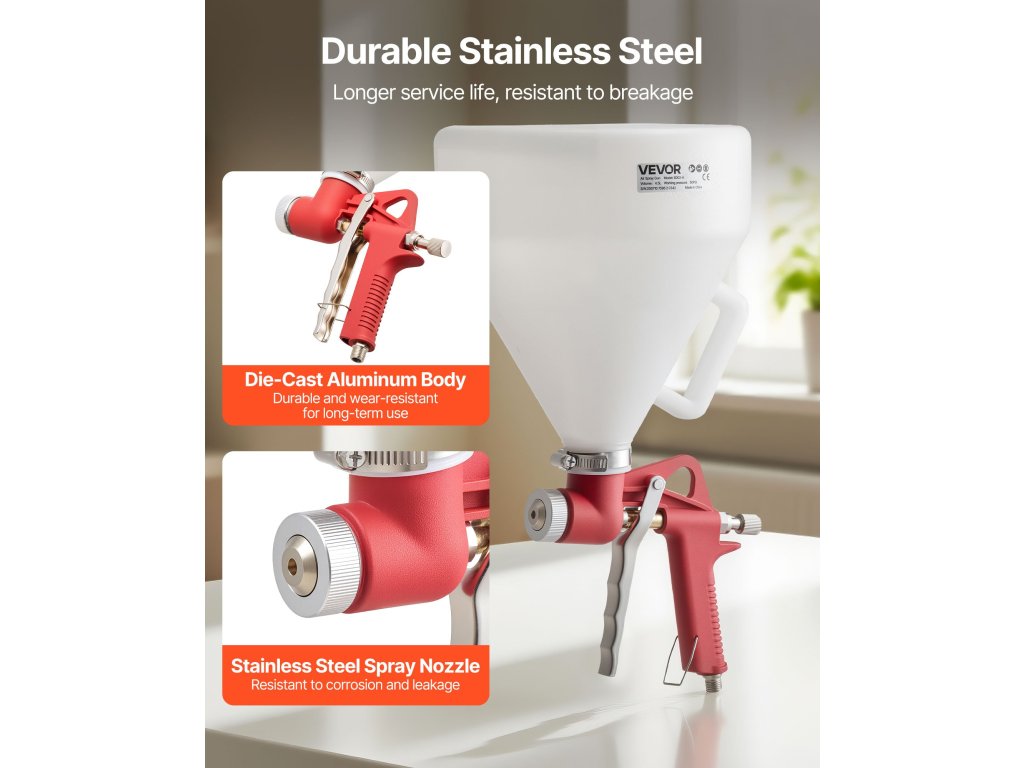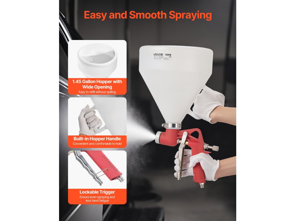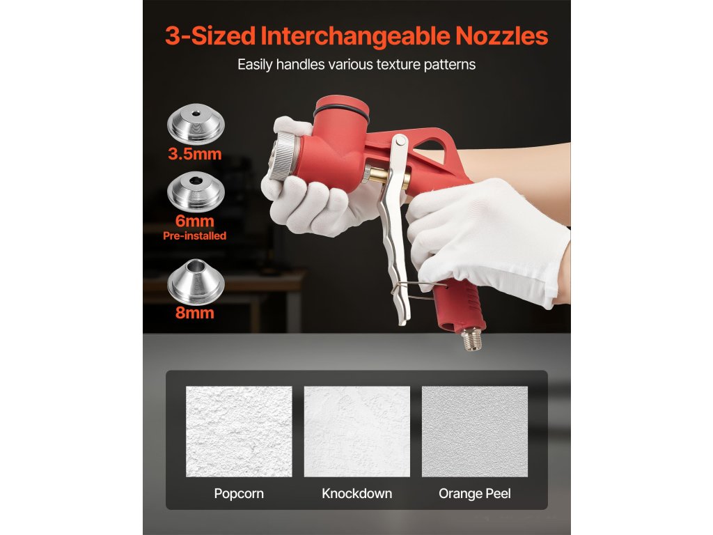 Új külsőt szeretne adni falainak és mennyezetének? A VEVOR Texture Air szórópisztoly megkönnyíti a dolgát! A 3 fúvókával, az állítható festékáramlással, a nagy kapacitású, 1,45 gallonos tartállyal és a precíz vezérléssel gyorsan elérheti a különböző textúrákat - popcorn, kopogós és narancsbőr.