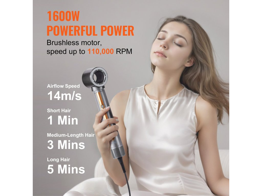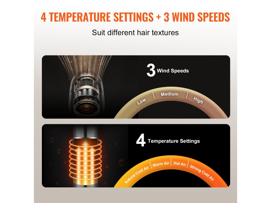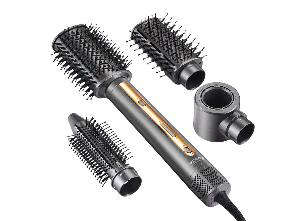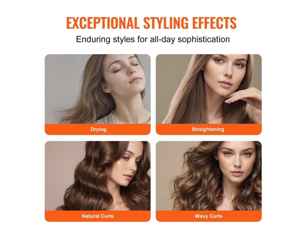 A VEVOR 4 az 1-ben hajszárító kefe 3 kefefejjel és 1 fúvókával (kerek, lapátos és kerek kefe, kerek hordófúvóka) van felszerelve, melynek köszönhetően könnyedén készíthet gyönyörű frizurákat és érhet el sokoldalú formázó hatást.