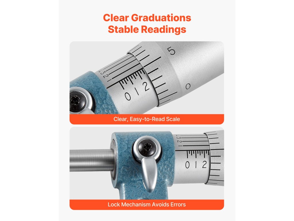 Ez a mikrométerkészlet edzett fémből készült a hosszú élettartam érdekében. Keményfémhegyű orsója és reteszelőmechanizmusa egyenletes nyomást gyakorol, így hosszú időn keresztül pontos méréseket biztosít, és megbízható műhelytársává teszi.