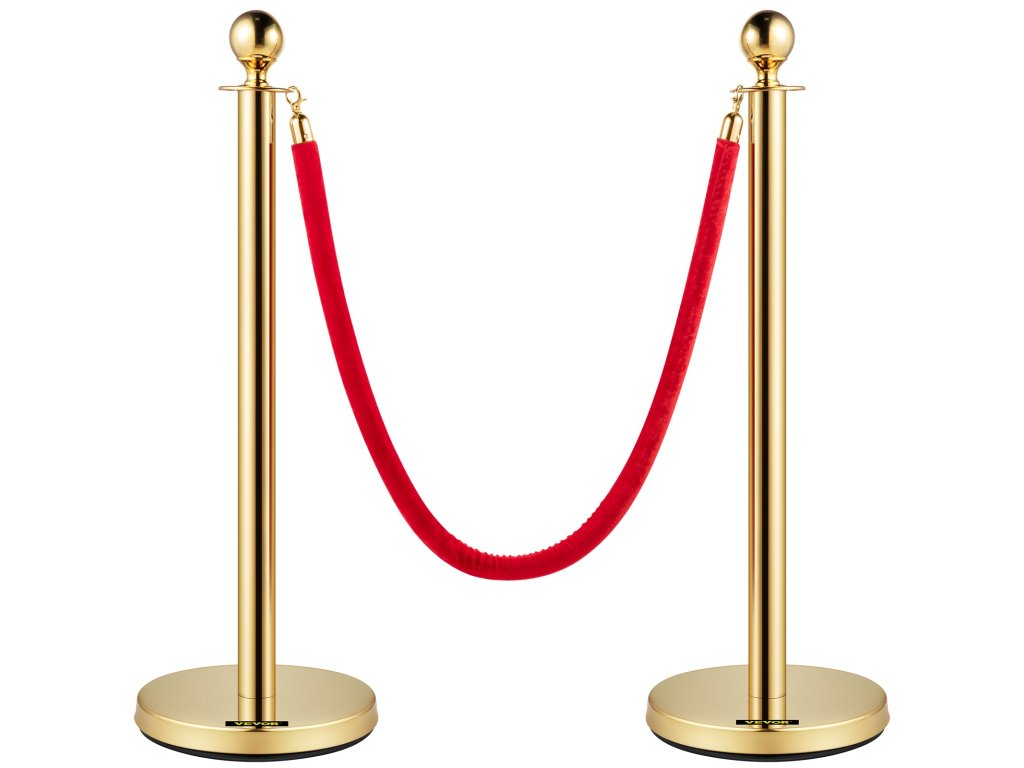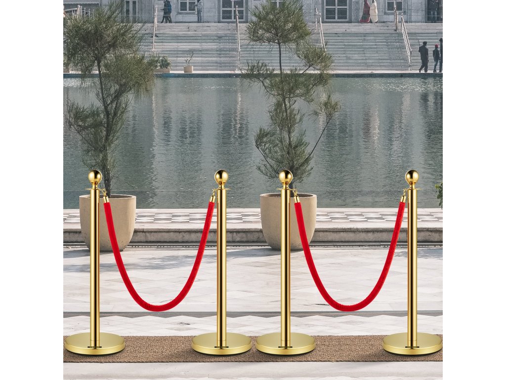 4 db arany színű rozsdamentes acél oszlop piros kötéllel, 1,5 m