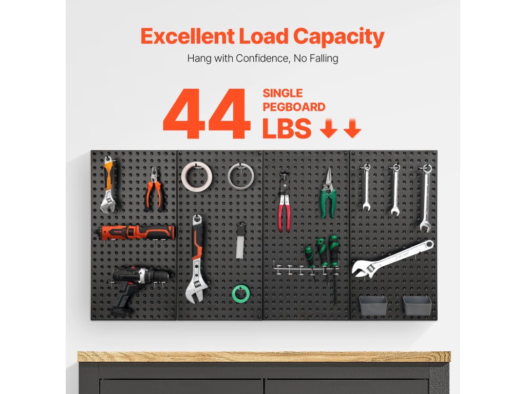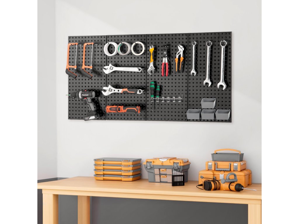 A fém tűlemezben rengeteg hely van, így különféle kampókkal, tartókkal és alkatrésztálcákkal párosítható. Legyen szó nagyméretű szerszámokról vagy apró alkatrészekről, könnyen megtalálja mindennek a tökéletes helyet.