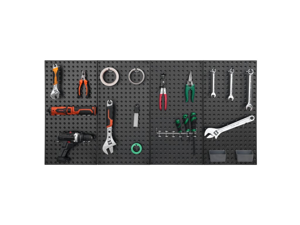 A szabványos lyukakkal ellátott kialakítású falra akasztható tábla a tárolási kiegészítők széles skálájával kompatibilis. Akár szerszámok felakasztására, akár tárgyak elhelyezésére szolgál, minden igényt kielégít.