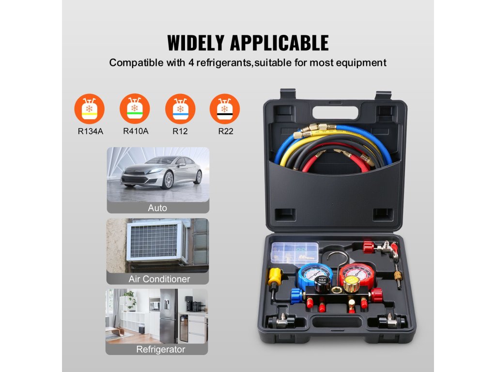 Táto súprava manometrov na meranie rozvodov klimatizácie je ideálna pre skúsených profesionálov aj začiatočníkov. Je kompatibilná s chladivami R134A, R12 a R410A. Je ideálna na nabíjanie automobilovej klimatizácie, domácu klimatizáciu a údržbu chladiacich zariadení. Je to oveľa viac než len náradie. Je to 4-cestná súprava meracieho prístroja na meranie klimatizácie, ktorá je navrhnutá tak, aby spĺňala potreby domácich majstrov aj profesionálov.