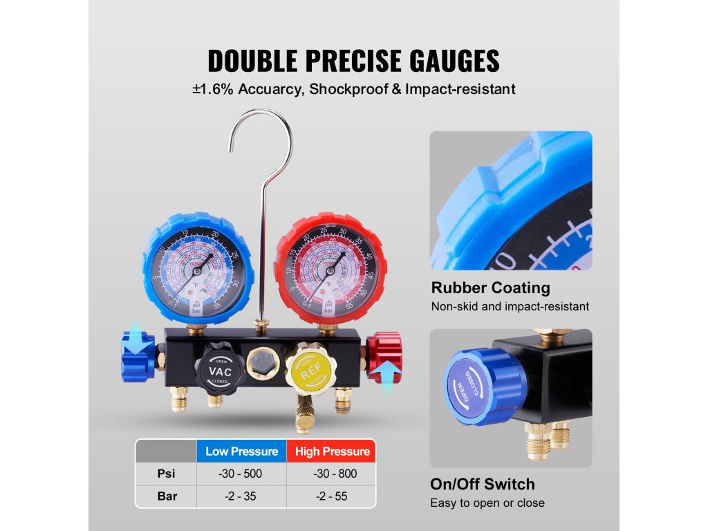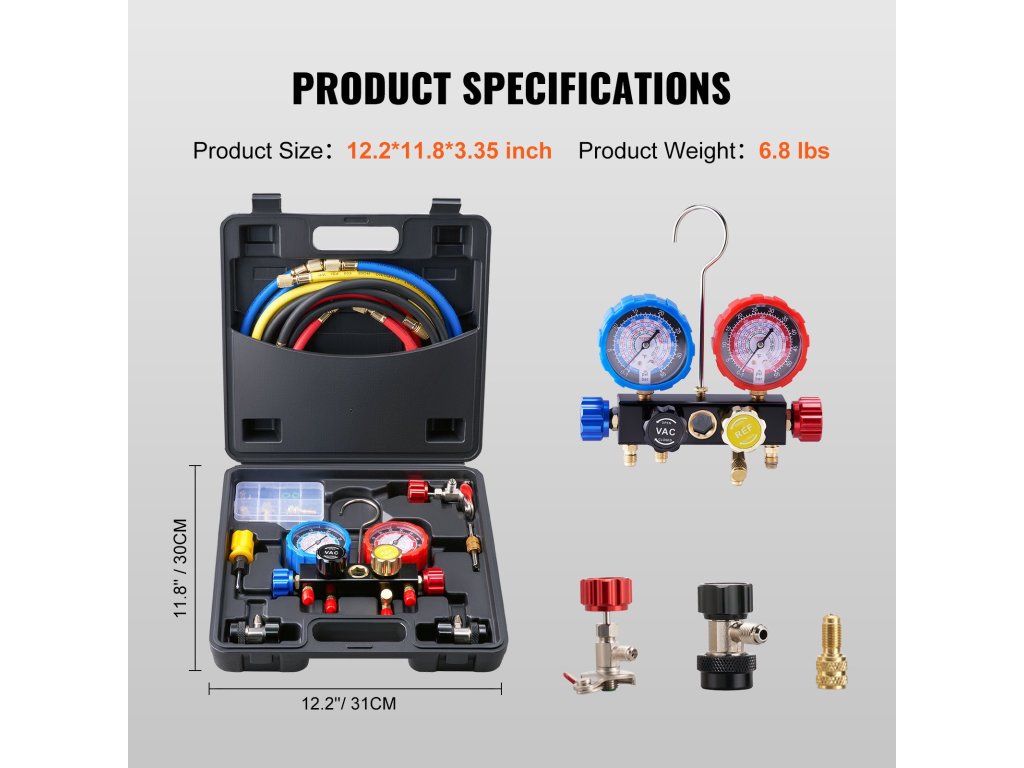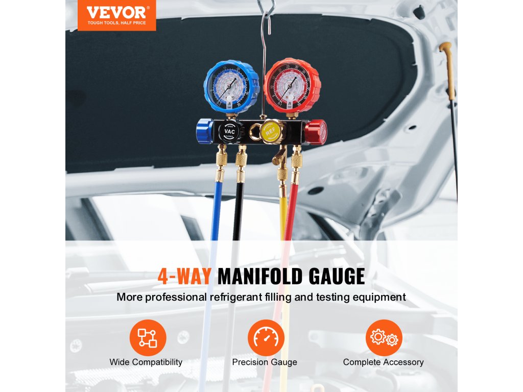 Súprava manometrov na meranie rozvodov klimatizácie VEVOR je spoľahlivým partnerom pre všetky vaše potreby v oblasti HVAC a automobilového priemyslu. Vďaka robustnej konštrukcii, presným rozmerom, ľahko použiteľnému prenosnému dizajnu a všestrannému použitiu je ideálnou súpravou pre začiatočníkov aj profesionálov. Vďaka inovatívnej konštrukcii je tento 5ft hadicový manometer AC kompaktnejší a prenosnejší. Taktiež má funkciu automatickej kalibrácie. Táto funkcia zaručuje, že namerané hodnoty budú vždy presné. Znižuje potrebu manuálneho nastavovania. Tým sa znižuje počet chýb používateľa a čas potrebný na údržbu.
