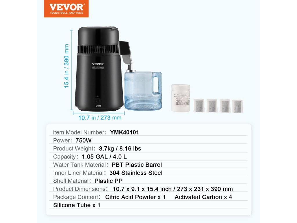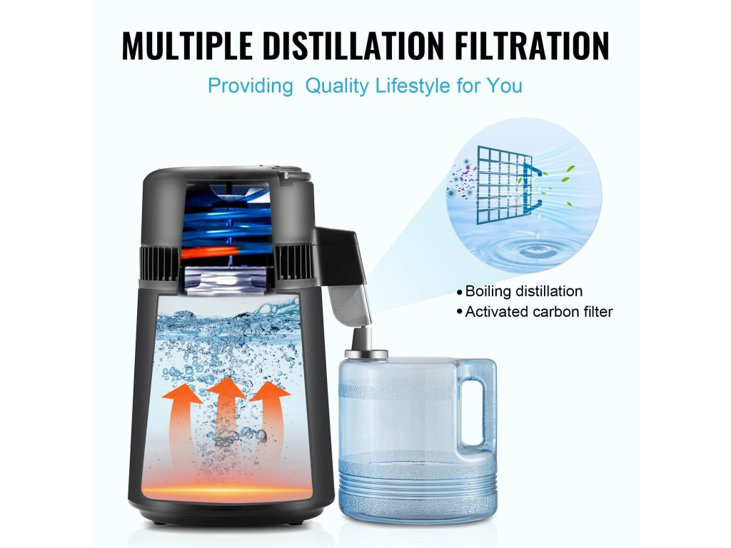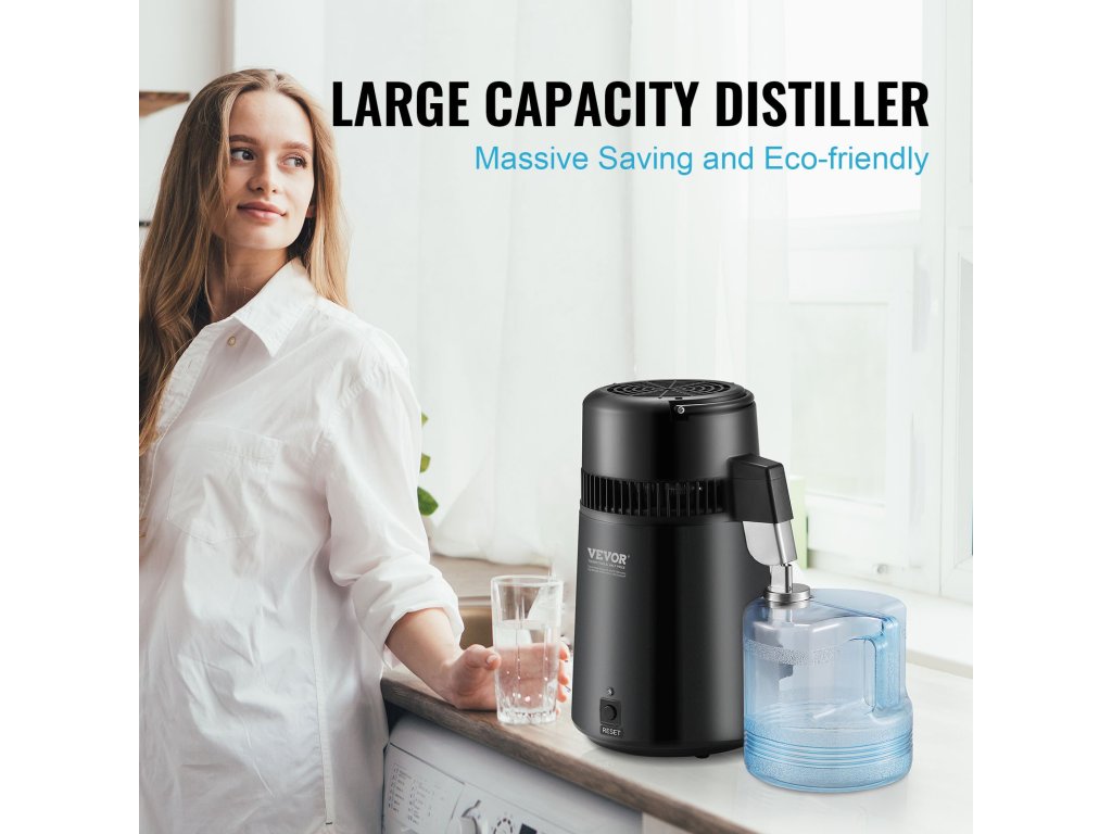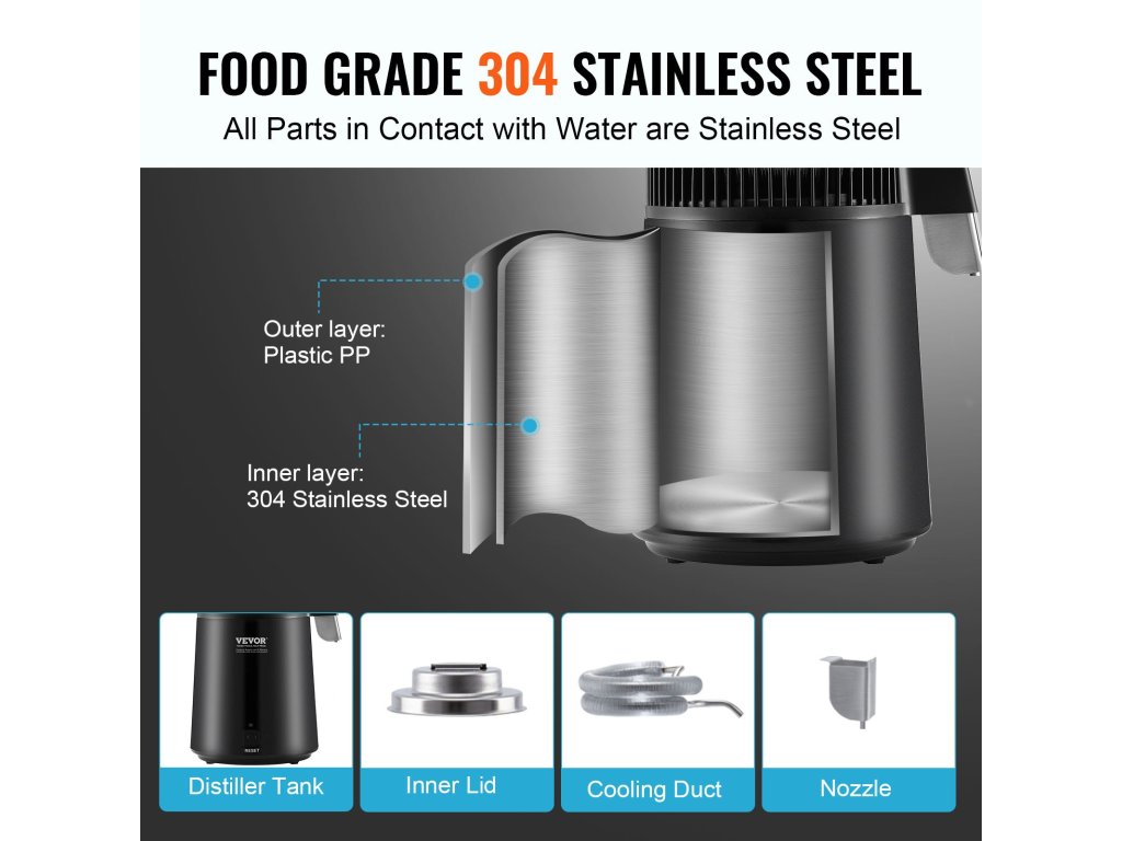 A 750W-os vízdesztilláló több mint 0,26 GAL/1L vizet termel óránként, a desztillációs kapacitás 6,3 GAL/24L naponta. Élelmiszeripari minőségű 304 rozsdamentes acélból készült, így védi az egészségét és biztosítja a folyamatos desztillált vízellátást.