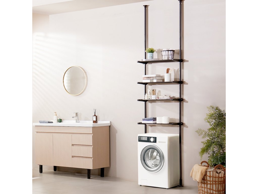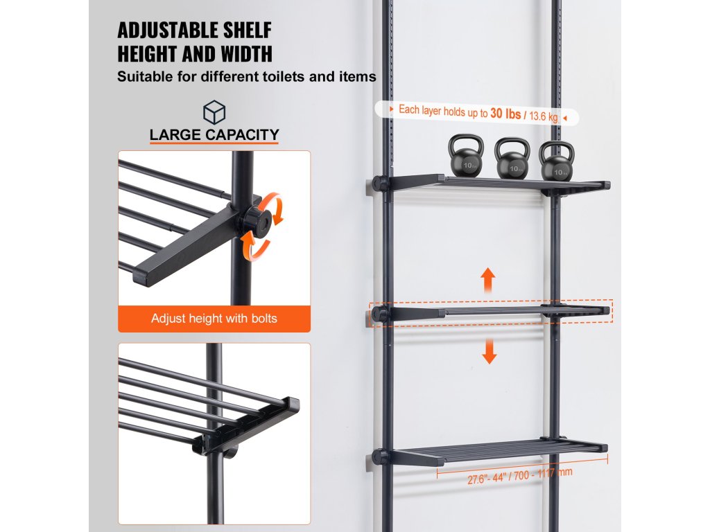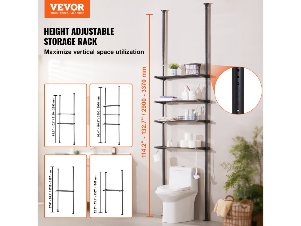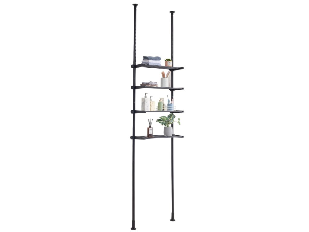 A teleszkópos rúdpolcok oldalán lévő anyák lehetővé teszik a polcok szabad magasságállítását, hogy különböző magasságú tárgyakat lehessen elhelyezni. A tartókeret szélessége is az alatta lévő bútorhoz igazítható, így ez a WC feletti tároló polc szűkebb helyiségekbe is jobban illeszkedik.