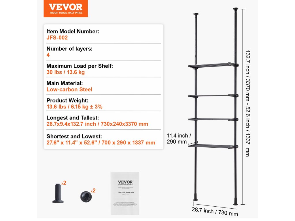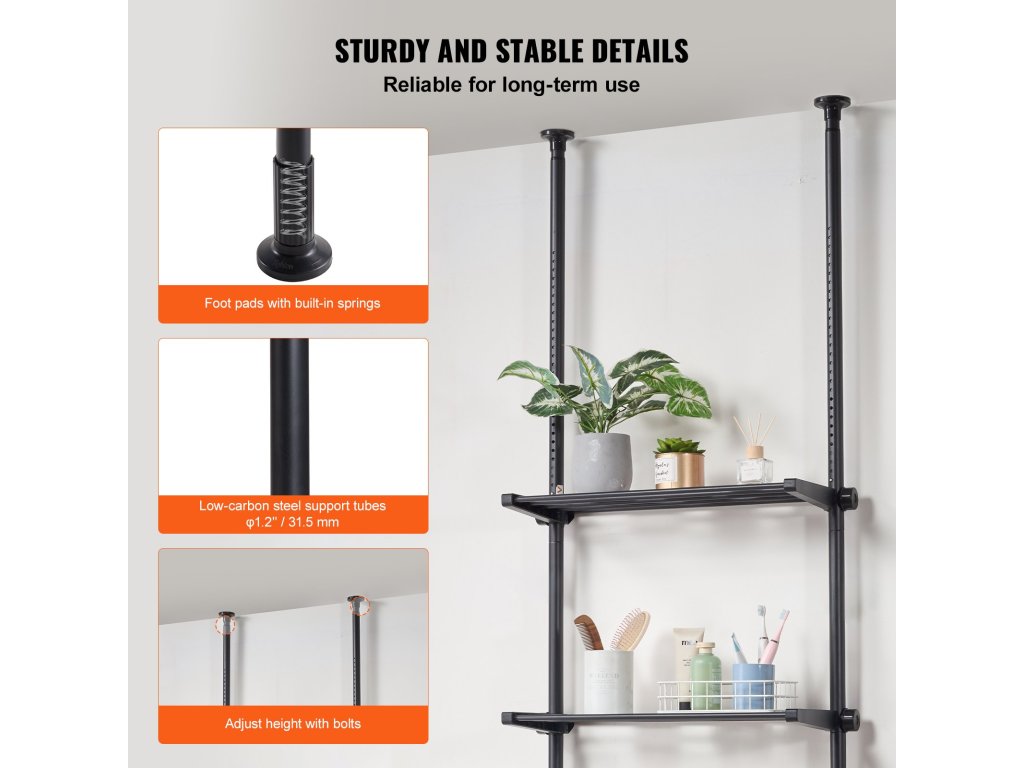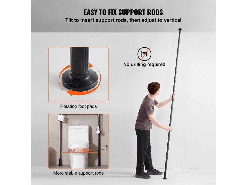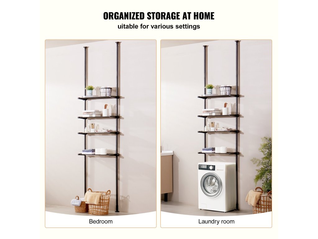 A teleszkópos rúdpolcok oldalán lévő anyák lehetővé teszik a polcok szabad magasságállítását, hogy különböző magasságú tárgyakat lehessen elhelyezni. A tartókeret szélessége is az alatta lévő bútorhoz igazítható, így ez a WC feletti tároló polc szűkebb helyiségekbe is jobban illeszkedik.