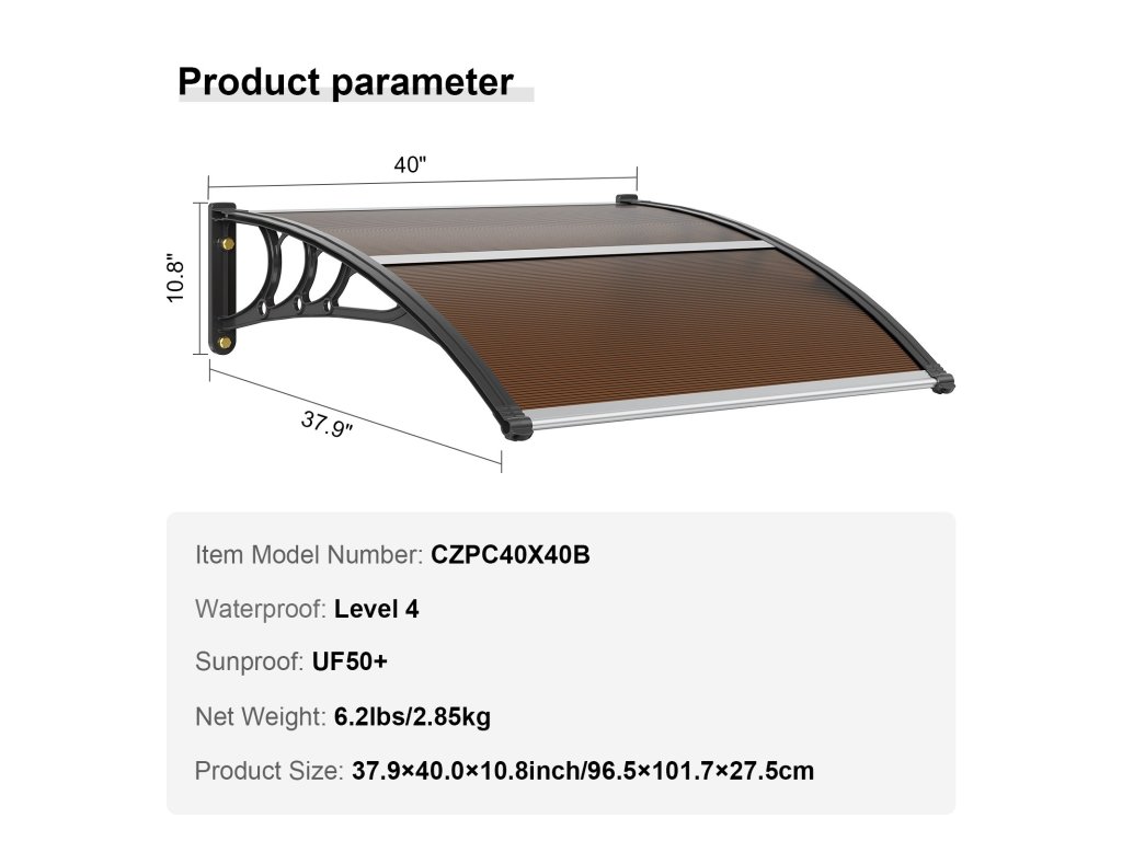 A napellenző átlátszó PC-panelekből, ABS-konzolokból és alumíniumötvözetből készült szerelősínekből készül, ami tartósabb minőségi garanciát biztosít. Korrózió- és rozsdaálló, így hosszú távú védelmet nyújt az erős széllel és a heves esőzéssel szemben. És ellenáll a magas és alacsony hőmérsékletnek egyaránt.