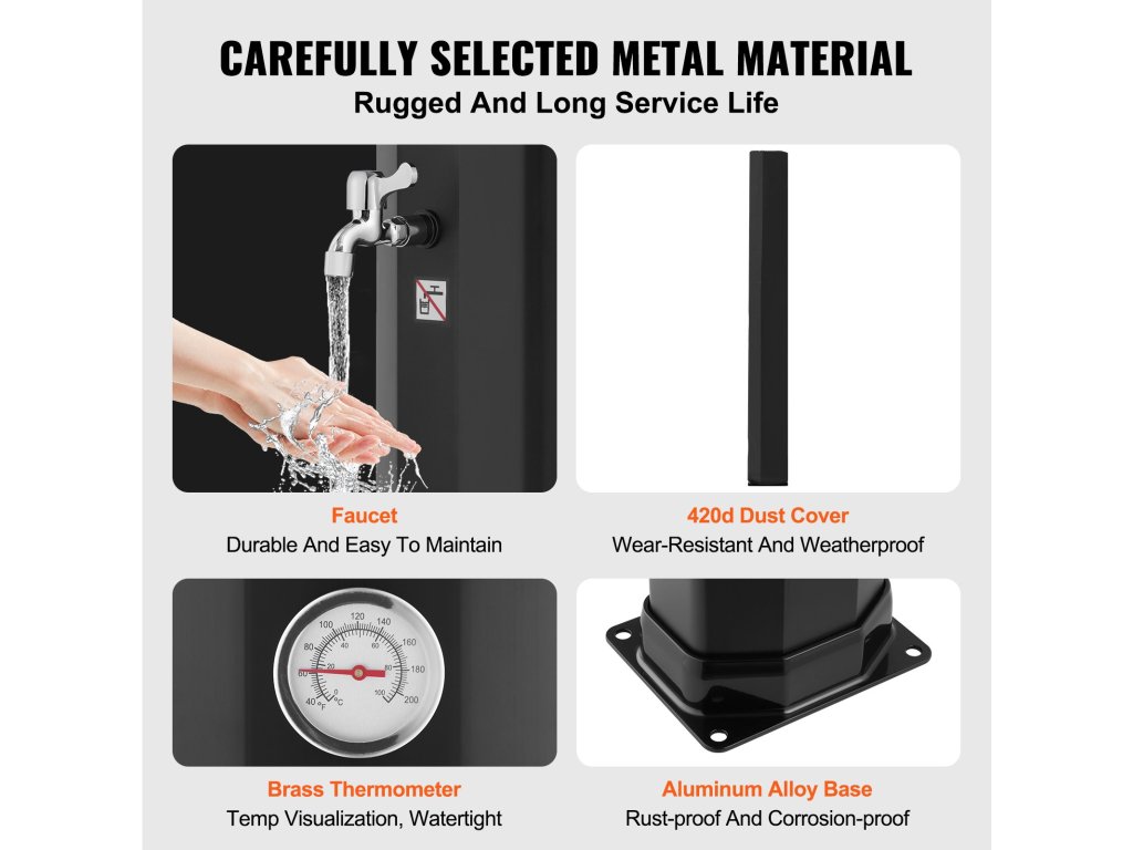 A teljes mértékben napenergiával működő fűtőberendezés 3-4 óra alatt 30 °C-ra melegíti a vizet anélkül, hogy további áramköltségekre lenne szüksége, így élvezheti a szabadtéri forró zuhanyzást.