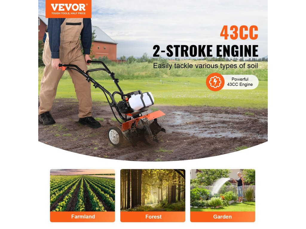 Még a kezdők is könnyen kezelhetik. A fogantyún lévő kényelmes kapcsolók segítik a fékezést működés közben. A fröccsenés elleni védőburkolat véd a fröccsenés ellen, így biztosítva a könnyű és biztonságos talajművelést.