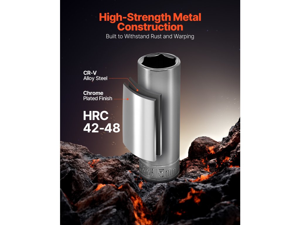 Ez a 3/8 hüvelykes dugókulcskészlet kiváló minőségű korrózióálló anyagokból készült, és kiváló ütésállóságot biztosít. A nagy nyomatékú kialakítás elegendő erőt biztosít a lefagyott vagy korrodált anyák kezeléséhez, így a javítás és eltávolítás gyorsabbá és könnyebbé válik.