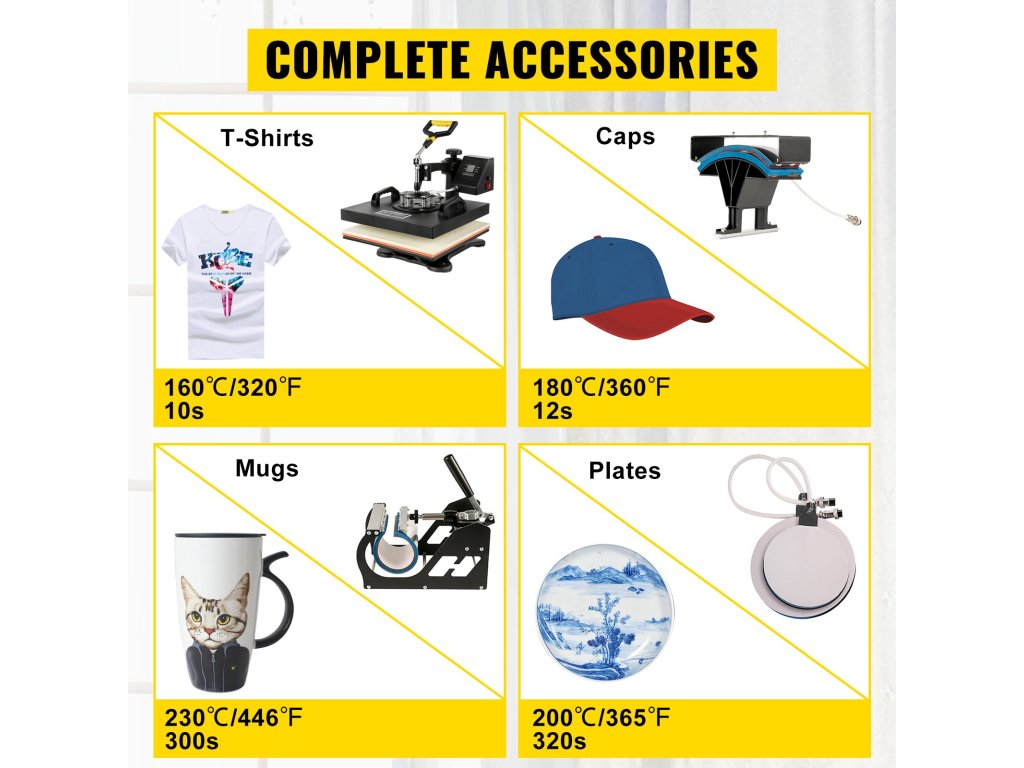 - 5 az 1-ben univerzális készlet: a nagyméretű, 15" x 15" (38 x 38 cm) méretű hőlemez sapkák, pólók, csészék, tányérok stb. átvitelére használható az állítható rugós lemez cseréjével különböző tartozékokkal, például csészeprésszel, sapkapréssel, egyszerű és közvetlen összeszereléssel. Az átgondolt kialakítás előnyös az egyenletes nyomáseloszláshoz.