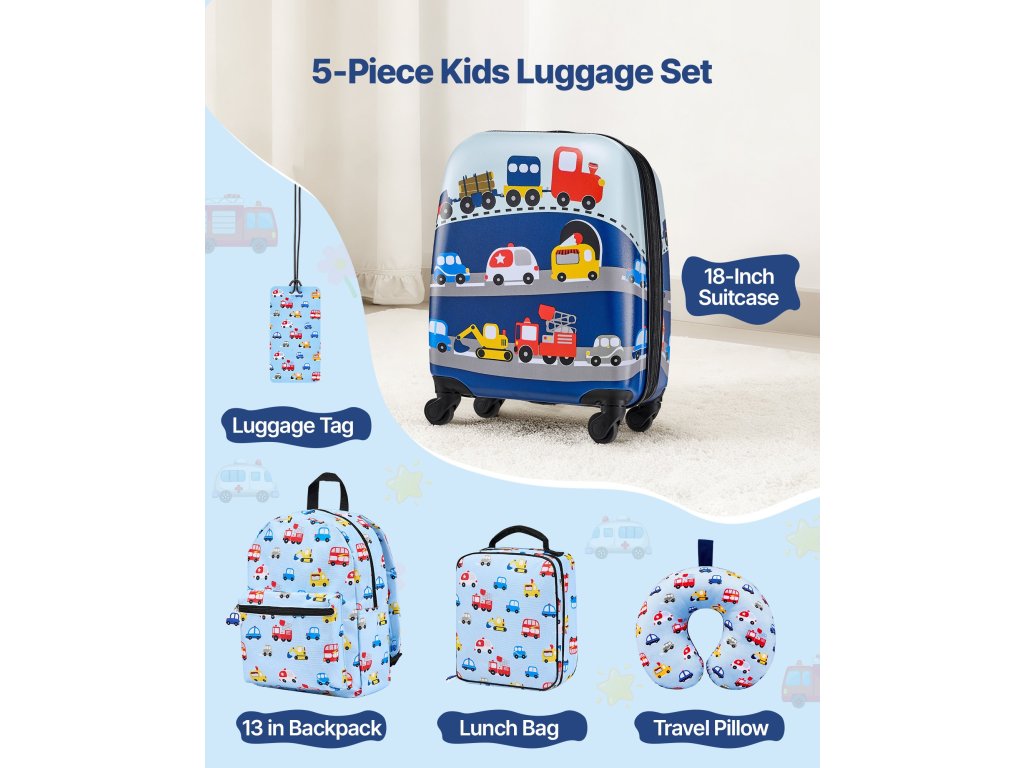 5 darabos gyermek szett, 45,7 cm-es kerekes bőrönd, hátizsák, párna