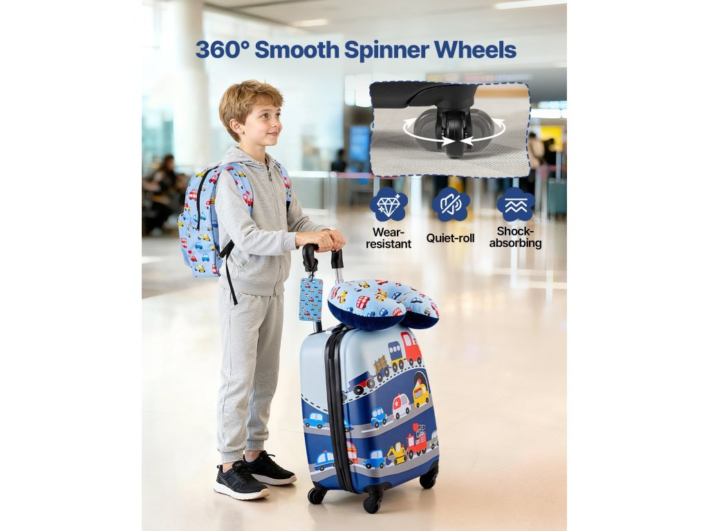 A kerekes bőrönd tartós héja légáteresztő 600D poliészterrel kombinált. A puha PP nyakpárna, a csendes forgó kerekek és a kényelmes fogantyú segít a gyerekeknek biztonságosabban és kényelmesebben utazni.
