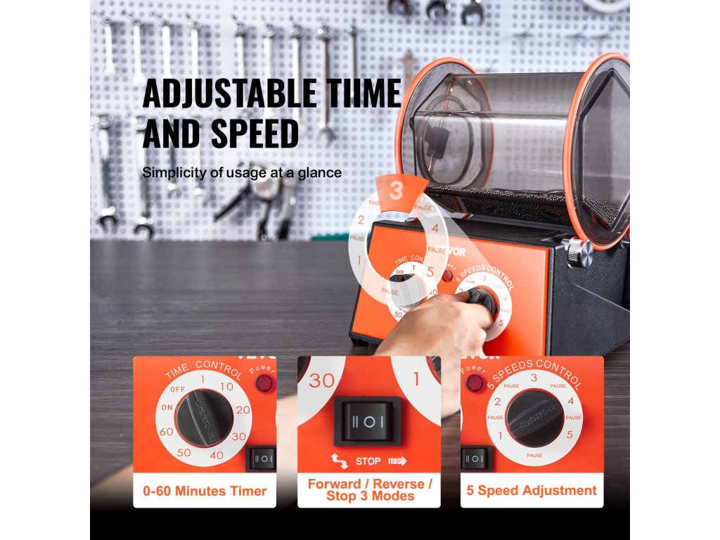 Az ékszerpolírozó dob kétirányú forgással, 5 sebességfokozattal és 10-60 perces időzítővel rendelkezik. A különböző anyagok különböző munkaidőt és sebességet határoznak meg.