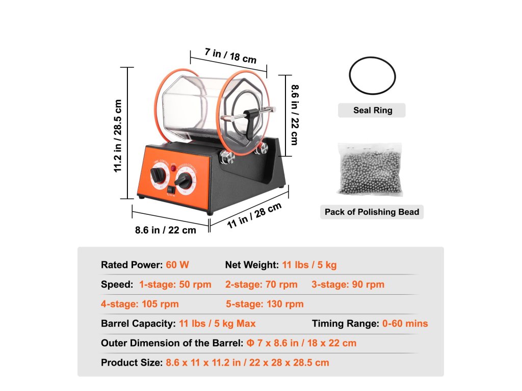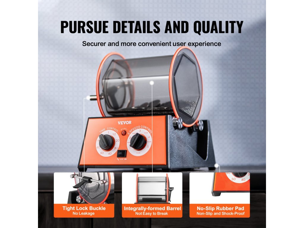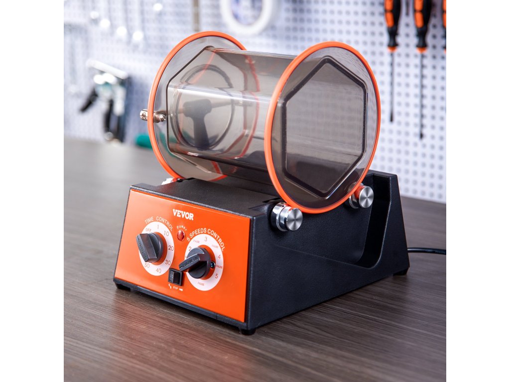 Ez a forgódob viszonylag egyszerűen kezelhető, és kiváló felületet biztosít az olyan anyagokon, mint a kövek, sziklák, érmék, tiszta patronok, sárgaréz stb. Átlátszó hengerrel rendelkezik, záró rúdzáras kupakkal. Kiválóan alkalmas stúdiómunkákhoz és kisebb ékszeripari projektekhez, például arany és ezüst polírozásához.