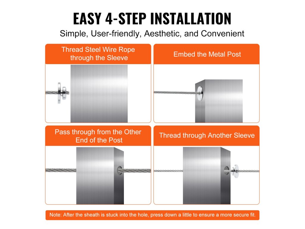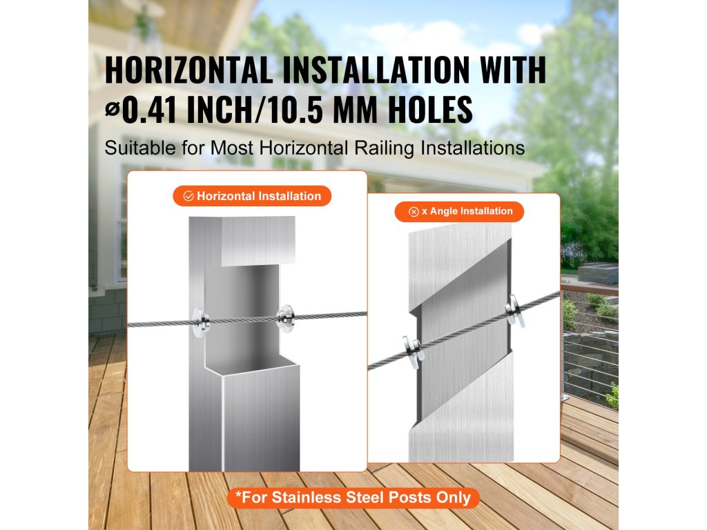 Ezt a korlátkészletet 1/8" acélkábel-szereléshez tervezték, és széleskörűen alkalmazható a legkülönbözőbb környezetekben, beleértve a belső korlátokat, kerti kerítéseket és tengerparti korlátokat, így nagyon kényelmes és sokoldalú.