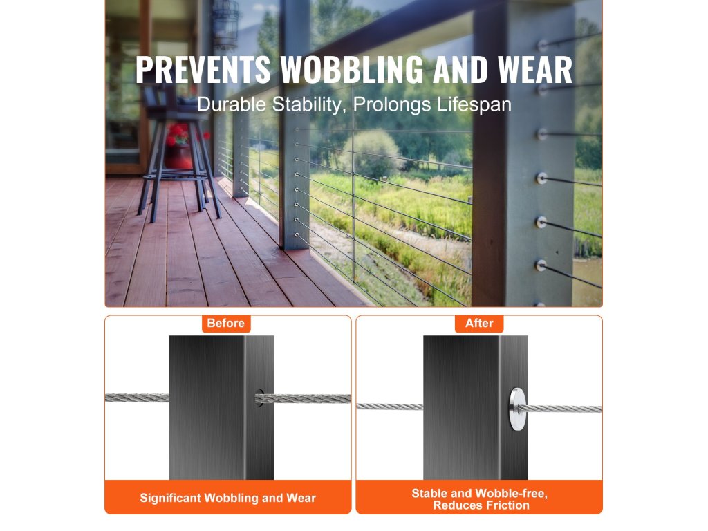Ez a korlátkészlet nemcsak az acélkábelek rögzítésére és a korlát kopásának csökkentésére használható, hanem a csúnya lyukak lefedésére is, javítva az általános vizuális esztétikát és megfiatalítva a szem előtt lévő tájat.