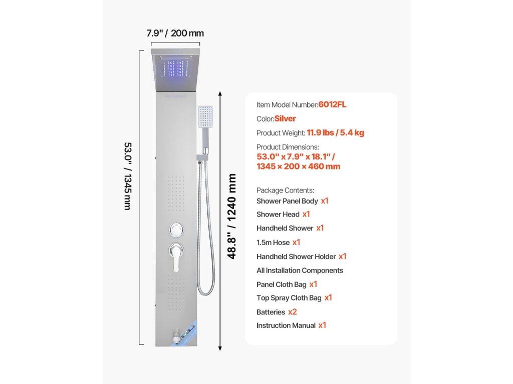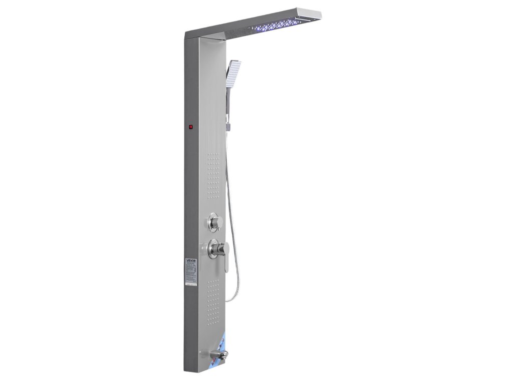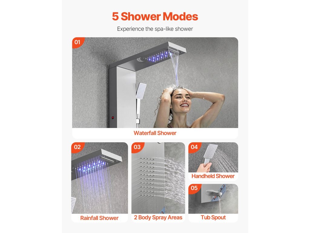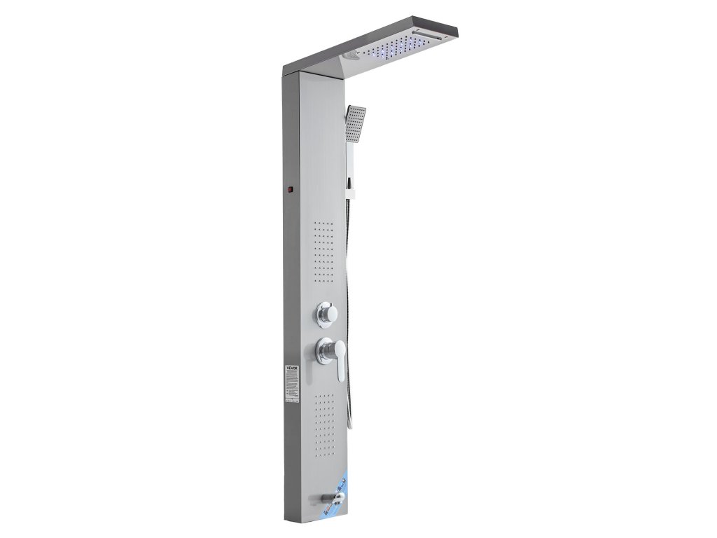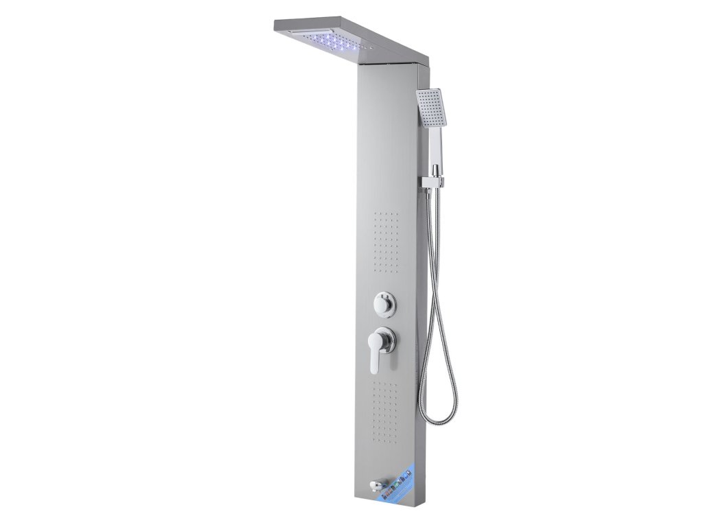 53-as zuhanypanel szálcsiszolt rozsdamentes acélból, LED-es világítással, 5 funkcióval, kézi zuhany