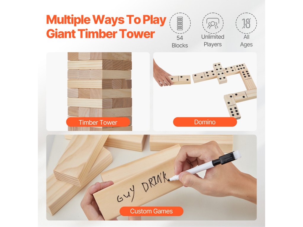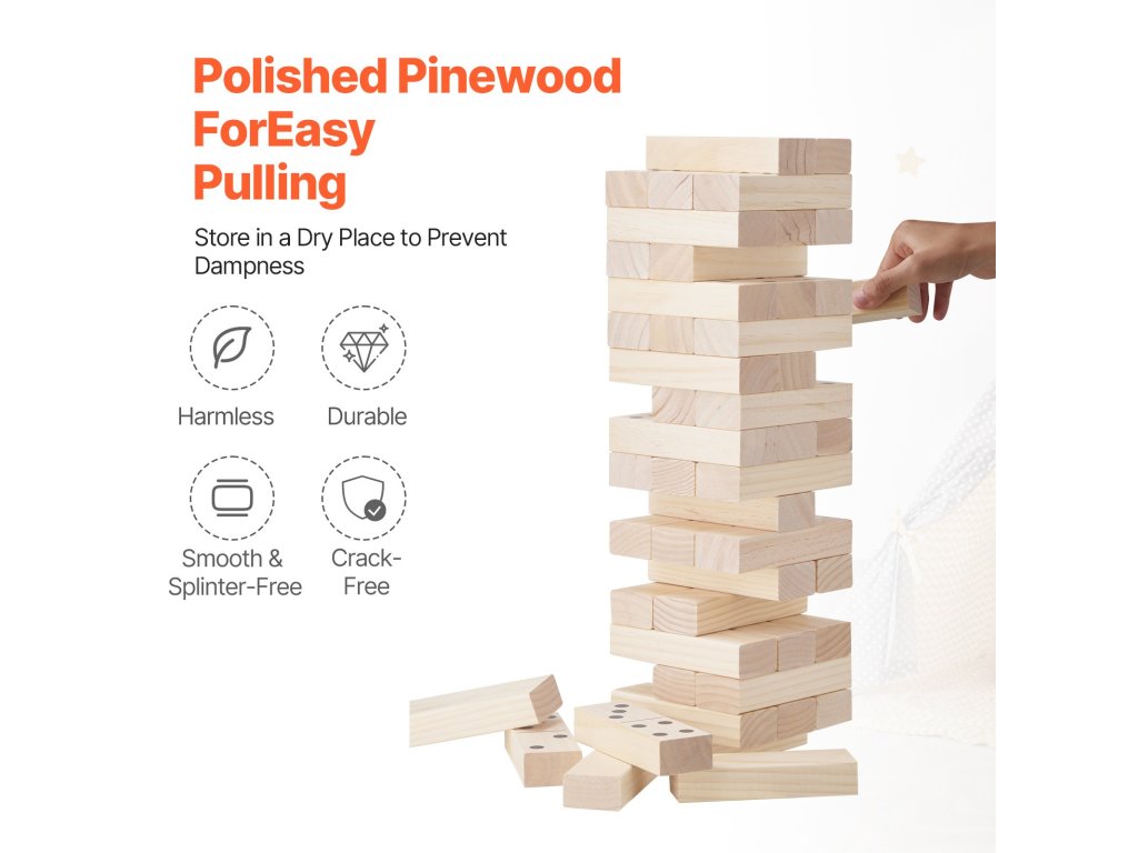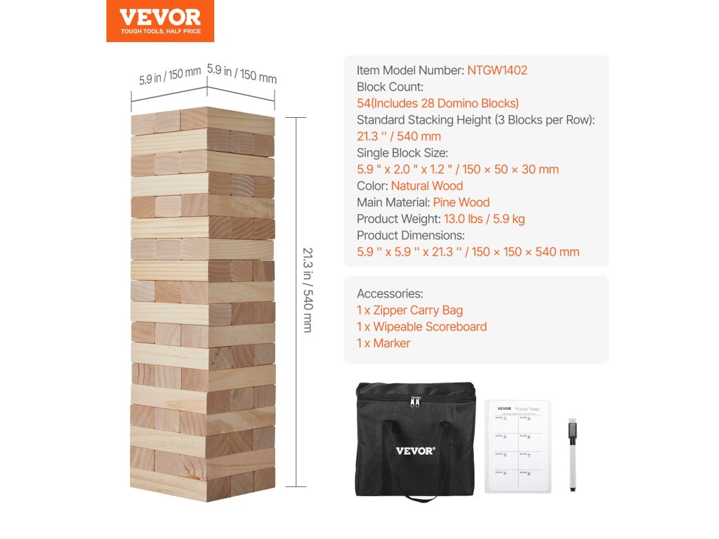 A fakocka készlet 54 kockát tartalmaz, amelyek mindegyike 5,9" x 2,0" x 1,2" méretű. Ezek közül 28 kocka dominópontokkal rendelkezik, így nemcsak a fából készült tornyok, hanem a dominó és az egyedi játékok is élvezhetők. Építsen egy akár 4 láb magas tornyot, és még több izgalmat éljen át!