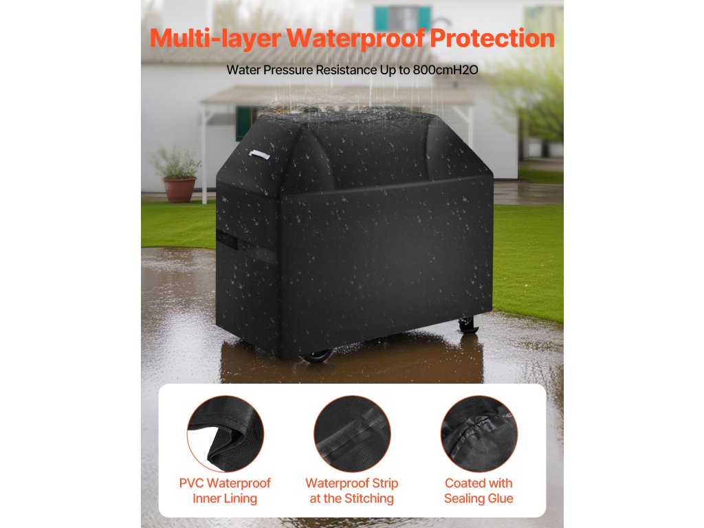 3 réteg kiváló minőségű anyagból készült: PVC réteg, poliészter szálas réteg és vízálló réteg. Ez a grillhuzat vízállóságot biztosít. A négy sarok megerősített, hogy ellenálljon a kopásnak. A varrás szorosan szőtt, hogy növelje a vízállóságot.