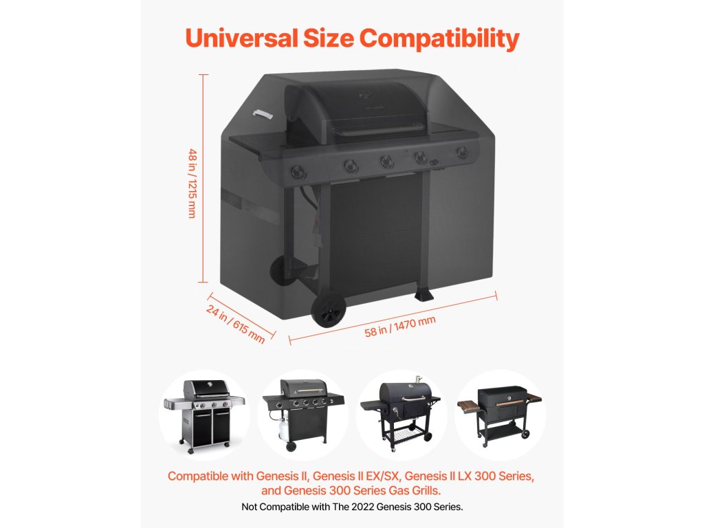 | Alkalmazható termékek | A Genesis II, Genesis II EX/SX, Genesis II LX 300 sorozatú és Genesis 300 sorozatú gázgrillekkel kompatibilis, legfeljebb 58 hüvelyk hosszú és 24 hüvelyk széles fedelekhez illeszkedik. Nem kompatibilis a 2022-es Genesis 300 sorozatú grillekkel. |