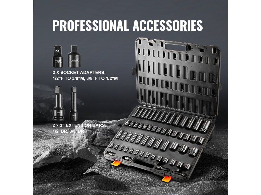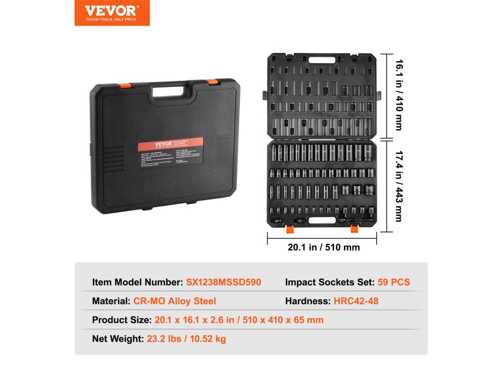 Professzionális és hordozható ütvecsavaros dugókulcs-készletet keres? az 59 darabos VEVOR ütvecsavaros dugókulcs-készlet teljes körű szerszámkészletet kínál, amely különösen alkalmas a különböző márkájú autók javításához.