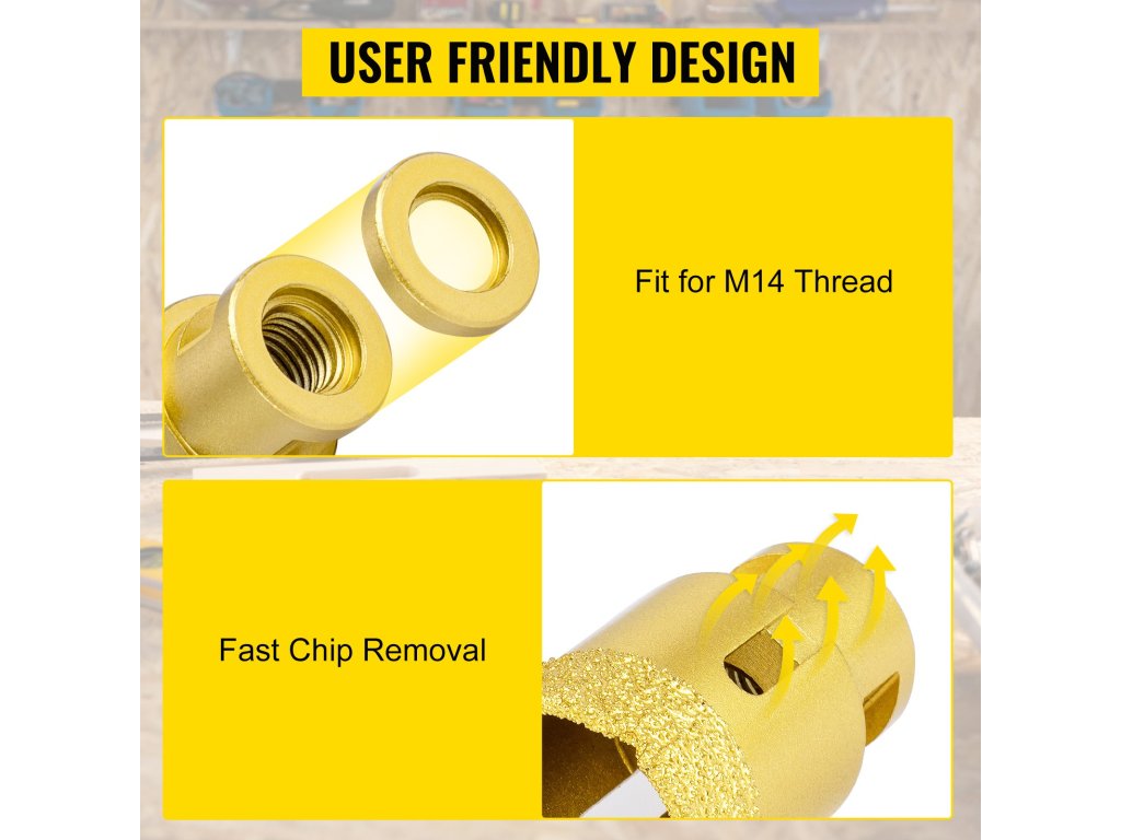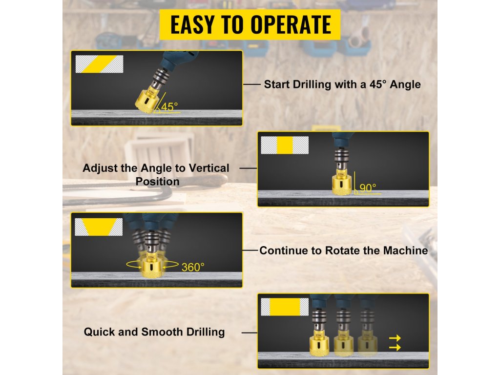 A csempefűrész tiszta és pontos lyukat biztosít a legtöbb kemény és koptató anyagon, például csempén, grániton, márványon, egyéb kövön és porcelánon.